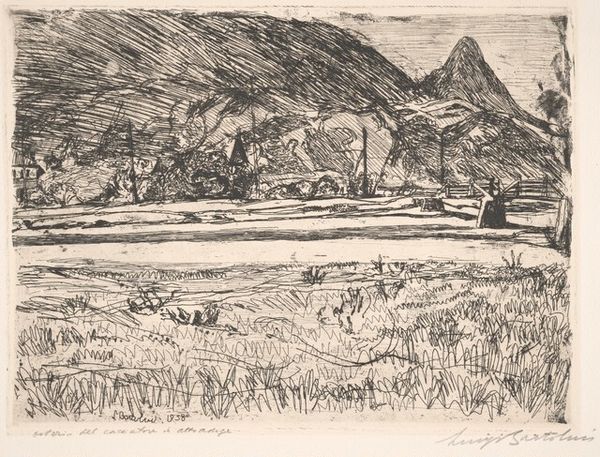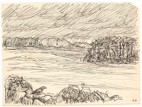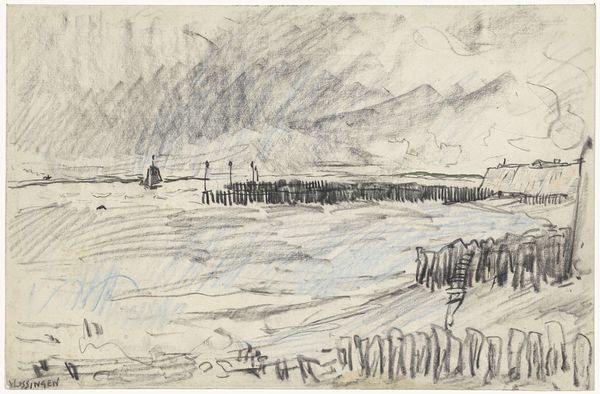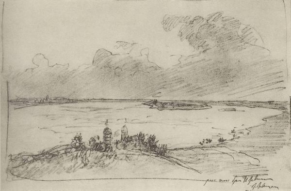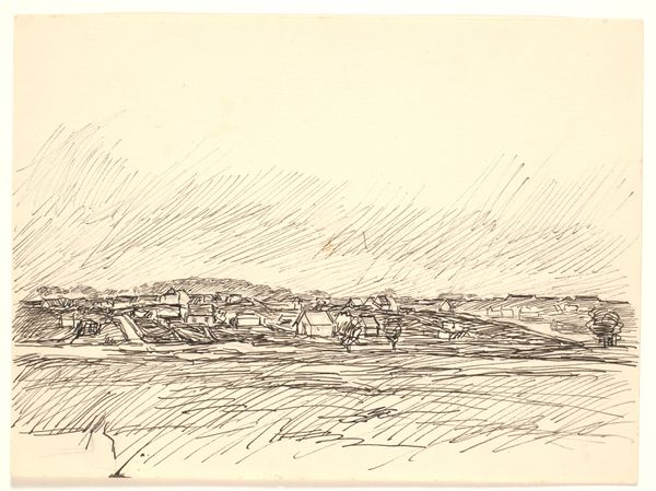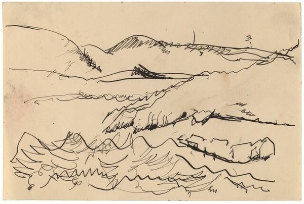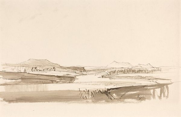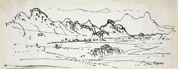 Curator: Before us is John Piper's "Traeth Mawr," a landscape drawing held at the Harvard Art Museums. Editor: It's immediately striking how the gray washes lend it a bleak, almost post-apocalyptic feel, despite its modest size. Curator: Piper was fascinated by the Picturesque aesthetic. This is evident in the rough textures and how he captures the sublime within the British landscape. How might this resonate with contemporary concerns? Editor: Considering the socio-political climate, the image, though created much earlier, mirrors anxieties about environmental degradation, doesn't it? The stark landscape speaks volumes about human impact. Curator: Absolutely. It encourages reflection on our role in shaping the environment and the stories we tell about our place within it. Editor: It also makes me wonder about artistic responsibility, its purpose and how we interact with places.