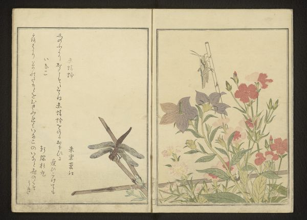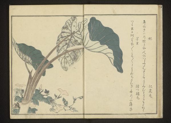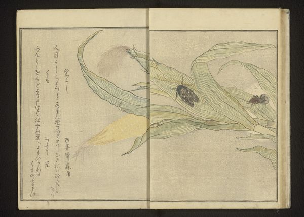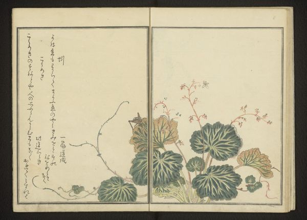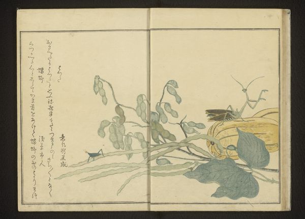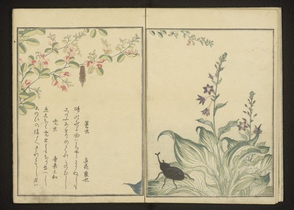 Curator: Oh, I’m just drawn into the hushed world Utamaro creates in this work. He painted this drawing on paper with ink in 1788. It’s entitled "Grasshopper and centipede on aconite plant," and currently it resides at the Rijksmuseum. Editor: My first thought? Dangerously beautiful! The botanical illustration feels so delicate, almost clinical, yet there's something lurking with the centipede that brings about feelings of threat. Curator: Threat, exactly! It's a whisper of mortality amidst the flowers. Utamaro often played with those contrasts, didn't he? Editor: Absolutely. You see it so clearly in the positioning. Aconite is poisonous, after all, and was frequently used in traditional medicine—a cure and a cause for harm existing simultaneously. It challenges our binary understanding of the natural world. Curator: And isn’t that something so typically Asian? What’s often considered the East and West has traditionally been the dichotomy between life and death but also natural life is respected regardless of threat. Look at the ink washes, so faint, like fleeting moments... as if existence is nothing but these delicate lines. The figures almost disappear in pale colours against a soft cream tone in the background. It's that transience that hits you right in the soul. Editor: It makes you question what narratives we attach to harmless figures such as a flower, a harmless insect. The way Utamaro has balanced these insects together. They’re normally cast as harmful because of their multi-legged figures, but on closer inspection it is an attempt to highlight the natural order of co-existence. They become vulnerable to us in this painting, and their relationship as predators or equals almost humanizes them to an almost satirical gaze in a world of systemic, societal hierarchies. Curator: Systemic societal hierarchies, indeed. I find myself wondering about those unsaid conversations Utamaro may have wished to express in this print between men, women, children and the power each have over each other. But looking closely, each form feels so intentionally placed on the leaf of the plant and placed with grace. This makes me appreciate Utamaro’s choice in featuring the common lifeform more deeply! Editor: Ultimately, it's this intersection of danger, beauty, and societal reflection that makes Utamaro's work so incredibly potent and contemporary. We should question the relationships in front of us.