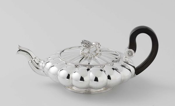 This is a silver ladle decorated in the Neo-Gothic style, likely created by Johannes Lambertus Kroymans. Notice how the artist employed a blend of smooth and heavily ornamented textures throughout the piece. The ladle's bowl is densely packed with elaborate, stylized foliate motifs, evoking the pointed arches and clustered details typical of Gothic cathedrals. The handle, in contrast, is more streamlined, featuring longitudinal lines that offer a sleekness which provides a visual break from the bowl’s complexity. The interplay between the bowl's elaborate Gothic revivalism and the handle's relative simplicity challenges a singular interpretation. One could argue that this contrast destabilizes fixed meanings, inviting viewers to reconcile the opulence of historical aesthetics with a functional modernity. The spoon becomes an emblem of its time, balancing reverence for the past with forward-looking design. Consider how Kroymans uses the reflective properties of silver, creating a dynamic interplay of light and shadow that activates the surface and suggests that even a utilitarian object can participate in a larger discourse about history, taste, and the cultural meanings embedded in design.