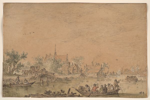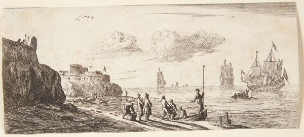 Curator: This delicate etching by Conrad Meyer, dating back to 1649, is titled "Winter." What do you make of it at first glance? Editor: It feels both serene and bustling! The icy expanse dominates, but is animated by all these tiny figures—people at work and play. The line work, I have to say, has a real handcrafted sensibility, a sense of individual labour invested in its creation. Curator: Precisely! Consider the sociopolitical context: in 17th-century Europe, representations of daily life often carried moral and even political weight. How does the activity depicted intersect with societal norms or class structures of the time, would you say? Editor: It presents a kind of collective resilience, doesn’t it? Winter imposes hardship, yet the community is actively finding ways to subsist and take pleasure. I'm interested in the way etching allowed for relatively easy reproduction and circulation, expanding access to such imagery. It’s a very democratic medium in some sense. Curator: I'd say so. Look at how Meyer positions the city on the horizon, not as a detached backdrop, but rather integral to the overall tableau of the print. It underscores how interconnected the rhythms of the city are to the rural life that plays out upon this ice-covered ground. Genre scenes such as these gave voice to the middling and lower classes of society that often were not portrayed, except as allegories or caricatures. Editor: You’re absolutely right. We can't ignore that the frozen landscape becomes a shared terrain where hierarchies become somewhat less defined through mutual need and shared pastimes. Also, the textural qualities achieved via etching replicate a sense of the harshness of the season and what people did to face it, no? Curator: Yes. These individuals appear as participants rather than isolated actors. They share common conditions, like the effects of the cold. I wonder what role it played in unifying those very classes, since the weather never discriminates. Editor: A key observation! The material act of creation, using etching to depict these scenes of shared labor and leisure during winter, provides valuable insight into the era’s means of artistic production. I am truly drawn to that the etching captures this period's daily grind, especially since such material insights often elude mainstream art criticism. Curator: For me, this winter scene by Meyer is a perfect illustration of how we may study artwork. From materials to the narratives that intersect in each mark on this print, we can grasp the complex web of identities and lives interwoven in this period in time. Editor: Yes, it prompts to us look past mere depiction to observe production itself, unveiling significant and very important details in art history.