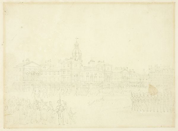 Editor: Here we have "Study for Somerset House, Strand, from Microcosm of London," dating back to about 1809, by Augustus Charles Pugin. It's an etching in ink, graphite, and watercolor. What immediately strikes me is the linear quality of the drawing; it almost feels architectural in its precision, and perhaps a bit sterile in that precision. What do you see in this piece? Curator: Your observation is quite astute. The essence of this work resides within its meticulous rendering. Note how Pugin employs linear perspective, dividing the space with orthogonal lines. What effect do you think the limited tonal range has on your interpretation of the drawing? Editor: It feels almost like a blueprint. The light wash gives depth but not much warmth, thus a rather cold reading. Curator: Precisely. It's about the formal language. Consider the structure; a balance between the monumental facade and the implied depth of the streetscape. Do you perceive any tension created by this compositional choice? Editor: I see that it may not be entirely natural, yet compelling, yes. It does keep the eyes busy going in different directions as the artist guides us. What strikes me is how modern this aesthetic seems in spite of being over 200 years old. I imagine it could be a great preparatory drawing for an elaborate finished etching or watercolor, a peek into the making of the London Microcosm series. Curator: Indeed. The inherent formalism, its rigorous design and carefully planned construction are crucial. Editor: That’s given me a new way to approach architectural drawings. Curator: And it reinforces the importance of structure over sentiment.