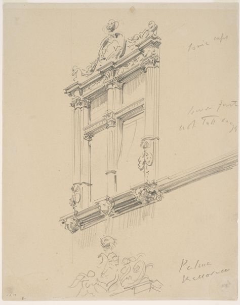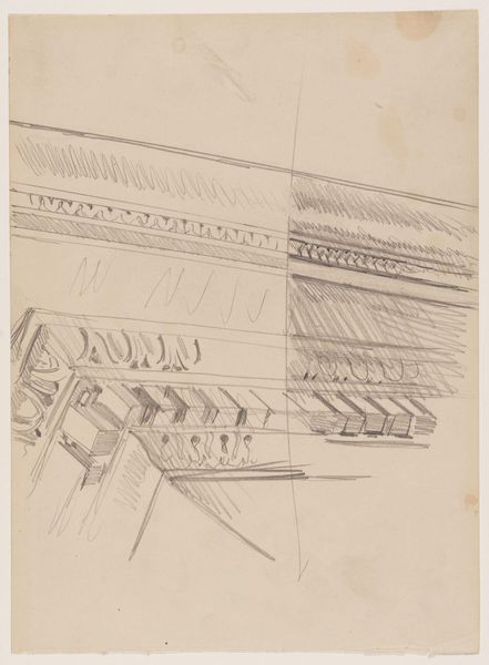 Editor: So, this is John Singer Sargent's sketch of "Pilaster Capitals and Entablature, University of Genoa." It feels like a quick impression, almost dreamlike. What catches your eye about it? Curator: Well, the immediacy, first. It’s like catching Sargent in the act of falling in love with the architecture. He’s simplifying these classical forms, the scrolls and moldings, isn’t he, making them almost dance on the page. You can almost feel the sun-baked Genovese air around it, can't you? Editor: It’s amazing how much he suggests with so few lines! Curator: Exactly! And notice how he uses the shading to hint at the weight and depth of the stone. It's not just a record; it's a feeling. Editor: That's true. I'll definitely be thinking about that next time I see a building! Curator: Wonderful! And I'll be trying to capture that feeling in my own sketches.