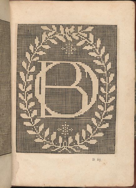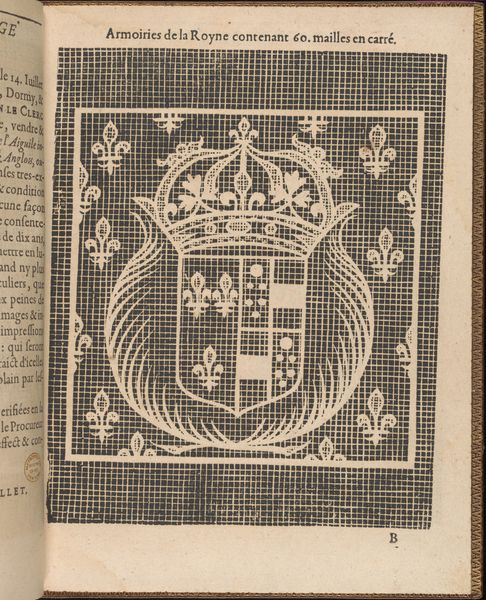 Editor: Here we have Matthias Mignerak’s "La Pratique de l'Aiguille, page 6 (recto)" from 1605, a print now held at The Met. The texture reminds me a little of woven fabric, or maybe even a digital screen! What catches your eye about this piece? Curator: You know, it does have a strangely contemporary feel despite its age, doesn't it? For me, it's the layering of patterns - the gridded background overlaid with that bold "M", wreathed in laurel and topped with a crown! I'm intrigued by how Mignerak uses stark black and white to create such a complex and decorative design. Doesn't it make you think about status? About royal power communicated through design? Editor: Definitely! It feels so intentional, like every line and shape has a purpose. The way the "M" is framed… what do you think it meant at the time? Curator: Well, given the title refers to needlework, and we see the word “Royne”, it was probably meant to be used as a template for embroidery, perhaps for a noblewoman's monogram? Imagine someone painstakingly recreating this in stitches! The grid probably served to allow people to copy and resize this elaborate royal design accurately. Does knowing this add to how you feel about the piece? Editor: It does! The skill involved in making something so intricate by hand, gives me a whole new respect for craft traditions, especially for women's artistic expression during this period. Curator: Exactly! This one page gives me insight into their craft and their aesthetic! Thank you for sharing your thoughts. I never looked at it quite like that before!