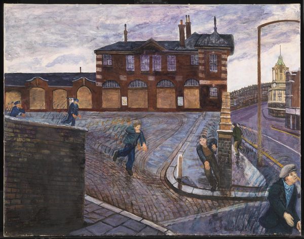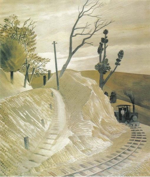Curator: This watercolor by Eric Ravilious, completed in 1935, is titled "Train Going over a Bridge at Night". Editor: Immediately, I'm struck by the eerie quietude of it. Despite the presence of a powerful machine like a train, the overall impression is of stillness and a kind of muted, nocturnal apprehension. Curator: I agree, and Ravilious really captures the intersection of the industrial and the pastoral. The steam billowing from the engine feels almost like another natural element in the landscape. Think about the materials here: paper and pigment creating the illusion of steel and steam. There’s a fascinating tension. Editor: Absolutely. That steam is crucial—it reads like a ghostly manifestation, adding to the painting's symbolic weight. Trains often represent progress, movement, and connection, but here, shrouded in darkness, it seems to hint at something else entirely. Maybe the disruption and unease accompanying industrial advancement. Curator: Good point. And watercolor as a medium, so often associated with fleeting impressions and outdoor sketches, feels unexpected for a subject as solid and impactful as a steam train. Ravilious painted "en plein air," right there in the field observing the effects of light over his subject. It shows that what you might think of as quick and delicate materials could convey something powerful and monumental, too. The trains were crucial for distribution of goods; he may be making an homage to their construction. Editor: You know, the bridge itself strikes me. As an established symbolic threshold. Moving away, perhaps? Together, they invite deeper reflection about technological progress at night when symbolic darkness rules. The composition draws your eye into this space, almost a void filled with the anxieties of that time. Curator: Ultimately, I’m drawn to how Ravilious, using the medium and technique available, turns the straightforward subject of a train into something both familiar and unsettling. Editor: I see this quiet work speaking volumes about the complex relationship between humans and machines, a cultural commentary veiled beneath a surface of technical expertise.
