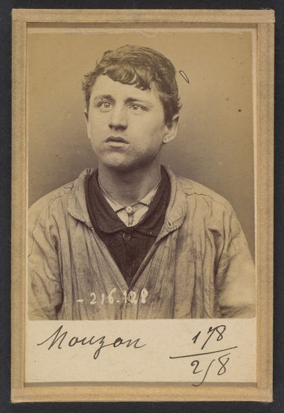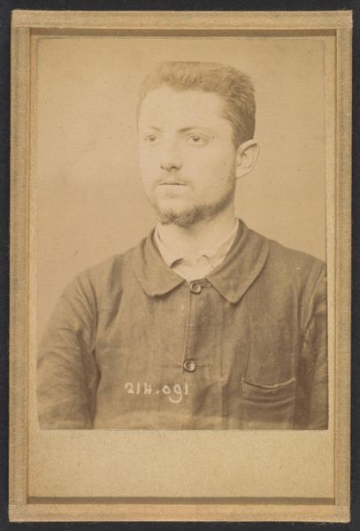Curator: This photograph, titled "Springer. François. 21 ans, né le 17/9/72 à Duisburg (Allemagne). Menuisier. Anarchiste. 17/7/94.", was taken in 1894 by Alphonse Bertillon. It’s a gelatin silver print, and it now resides here at the Metropolitan Museum of Art. Editor: It’s quite haunting, really. He’s staring right through you. It has a rather heavy, weighted feeling. The kind of quiet you hear right before a storm breaks. It's amazing that such an unassuming picture can carry such weighty undertones. Curator: This photograph belongs to a series of “criminal portraits” developed by Bertillon. He pioneered anthropometry, using precise body measurements to identify repeat offenders. It was meant to be a scientific endeavor. Editor: Science and soul collide, it seems. I see an attempt at objectivity, the desire to categorize, but also an undeniable human presence. A fellow barely out of boyhood standing accused—labelled. And it just brings me to an uneasy place of thinking about systems. Curator: Precisely! It reveals how institutional forces attempt to reduce individuals to data points. Notice the stark lighting, the clinical composition. All intended to serve a system of surveillance and control. His listed occupation as a carpenter and avowed politics as an anarchist add complexity. Editor: A carpenter's hands, potentially building, shaping… and an anarchist's heart, rebelling, questioning… I feel this internal battle radiating through the picture. Do you ever think the photographer imagined him? As a full human? Or just as data? Curator: That tension, the pull between objective record and subjective interpretation, makes this image so compelling, even today. Bertillon sought a purely objective record; yet, what remains is an individual facing the judgment of the state, captured in a single, silent moment. Editor: It's like the photo is yelling. This picture asks, "What do we do with those that don't fit?". Curator: Indeed, it serves as a potent reminder of how systems of power can define and constrain individuals, and of the ethical responsibilities inherent in systems of knowledge. Editor: Yes. What a journey. Looking at it this way just adds a layer of contemplation about what images actually do. Thanks for that little dark dive.