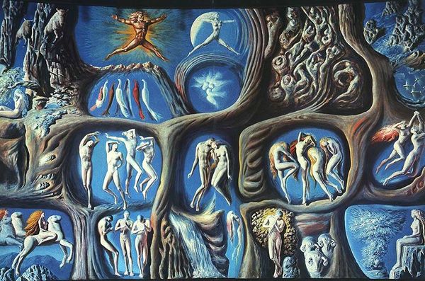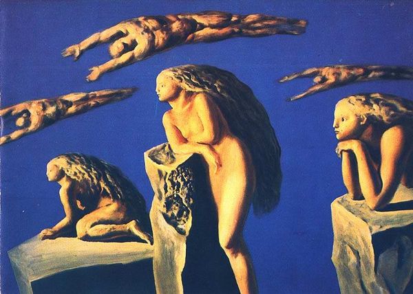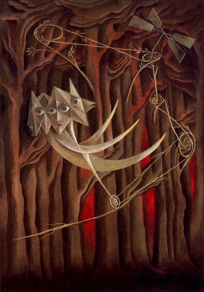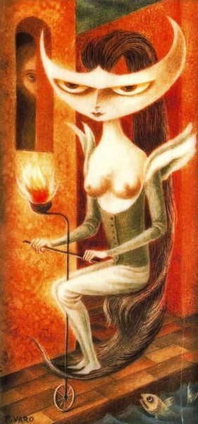 Victor Brauner made this painting, The Philosopher’s Stone, with what looks like gouache or tempera – a medium that dries quickly, allowing for flat, opaque colors and precise details. Brauner isn’t messing around with blending or shading. It’s all about laying down these solid blocks of color. Look at that tree. The lines are sharp and clean, no fussing. The roots are almost like veins or nerves, reaching out. Then there's this woman, or goddess, and a strange cat perched above a glowing polygon. The color palette is restrained, mostly earth tones, creating a dreamlike, otherworldly feeling. It makes me think of alchemy or some ancient ritual. You could almost say it’s like Remedios Varo. Ultimately, with this image, Brauner embraces the mystery inherent to art and invites us to ponder the unspoken.
