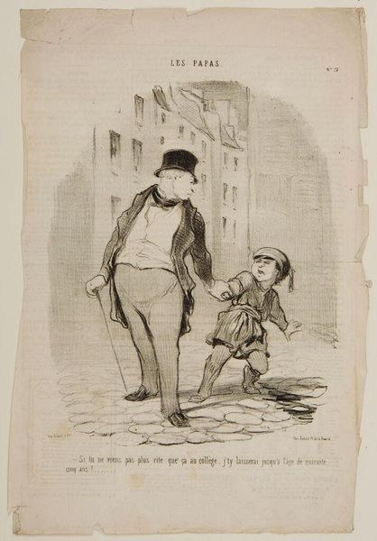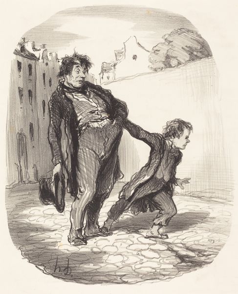 Here is the interpretation of Daumier's lithograph “Si tu ne viens pas plus que ça au collège…”. In this 19th-century print, the top-hatted father dragging his son to school is not merely a scene of daily life; it's a study of power dynamics and resistance. Consider the father's grip, the child's lagging feet, and the tension in their clasped hands. These aren't just gestures, they are symbols of an age-old conflict. The dragging motif, the reluctance of youth facing authority, echoes through art history. From medieval depictions of souls led to judgment, to Renaissance images of abduction, the forced march carries deep psychological weight. The child's resistance here is not unique, but a recurrence of humanity's struggle against imposed will. What Daumier captures is not just a father and son, but a timeless struggle between generations and the constraints of societal expectations. It is an emotional echo, a reverberation of the human condition caught in a fleeting moment.