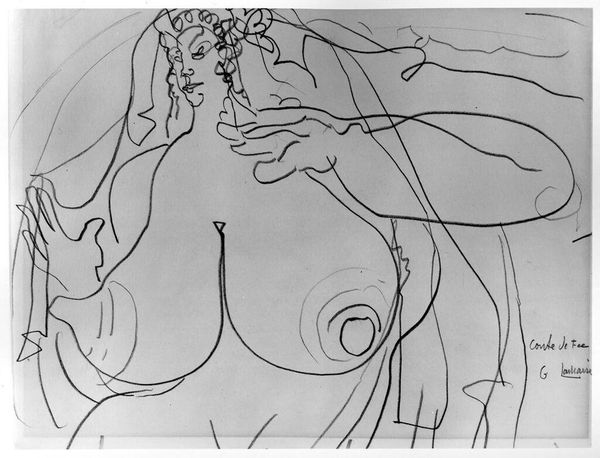 Editor: This is Gaston Lachaise’s "Female Nude with Draperies." It's a small drawing, just under 10 inches tall. The figure is quite striking, almost monumental in its simplicity. What do you see in this piece? Curator: The draped figure references classical sculpture, yet the linework is almost aggressively modern. Notice the stylized rendering of the breasts; how do those circular forms strike you? Editor: They’re unexpected, almost like symbols themselves. Curator: Precisely. The image holds cultural memory of idealized female forms, yet it also asserts a modern sensibility. Lachaise seems to be exploring how we still perceive the classical ideal within a modern context. Editor: So it’s about the tension between tradition and modernity? Curator: Indeed. It makes me wonder how future generations will interpret our own symbolic imagery. Editor: That's a fascinating thought!