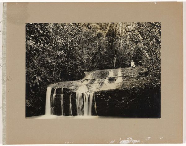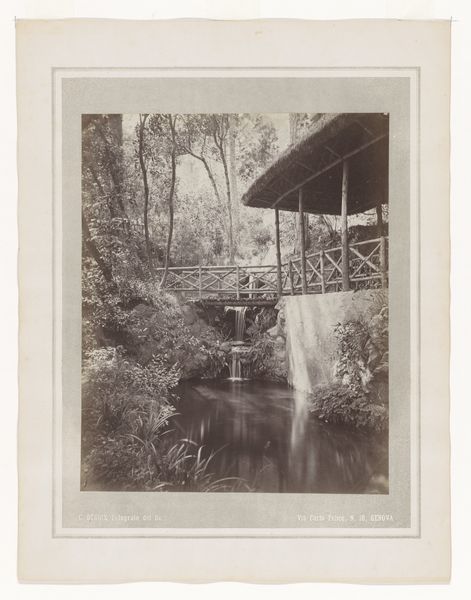 Woodbury & Page created this photograph titled 'Waterleiding overbrugt een kloof bij Buitenzorg'. The photograph features a man-made aqueduct amidst a lush natural landscape. Note how the constructed aqueduct contrasts with the organic forms of the foliage and the waterfall. The structural rigidity of the aqueduct is juxtaposed against the fluid, cascading water and the tangled vegetation, highlighting the intersection of technology and nature. The photograph presents us with a system of signs reflecting the complex interplay between culture and environment. The aqueduct, a symbol of human engineering, alters the natural course of the waterfall, suggesting a dynamic where technological intervention shapes the physical landscape. The dense foliage acts as a contrasting signifier of untamed natural forces, creating tension within the frame. The composition invites us to consider the photograph not merely as a depiction of a landscape, but as a commentary on human impact and our continuous re-shaping of the natural world.