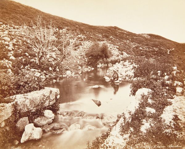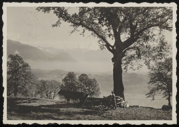 Curator: Let’s turn our attention to "Picturesque Susquehanna, Near Laceyville," a photographic print created around 1895 by William H. Rau. It presents a tranquil view of the Susquehanna River valley. Editor: My first impression is the soft light. It gives everything a gentle, almost dreamy quality. It reminds me of hazy summer afternoons and stories told in sepia tones. It’s a beautifully composed scene. Curator: Absolutely. Rau’s work fits into the Pictorialist movement, which sought to elevate photography to the level of fine art. This involved manipulating the image to create an artistic effect, emulating painting or etching. Here, we see his focus on capturing atmosphere. Editor: The composition is really something. That large tree dominating the foreground… it feels like it’s both framing the scene and also pushing us away from the view. I feel like an uninvited guest. Is this deliberate or am I reading too much into it? Curator: No, that is insightful. Consider the era. Industrialization was rapidly changing landscapes. This photograph presents an idealized, almost nostalgic, view of rural America. The framing by the tree could subtly imply the boundaries being contested by this change. A desire to preserve something pure and natural. Editor: That resonates deeply. It makes me think about environmental activism and the ongoing tension between development and preservation that is still relevant. The landscape genre isn’t simply about pretty pictures, but about what and how we value the natural world. Curator: Precisely. And look at the seemingly casual placement of the fence, adding a subtle element of human intervention in an otherwise wild landscape. Rau, intentionally or not, captured a moment of transition, that continues to have relevance for modern debates. Editor: This photograph definitely rewards a closer look. It transforms from being merely pretty to poignant. It’s like looking at a beautifully faded memory of something we’re afraid to lose. Curator: Agreed. Rau’s "Picturesque Susquehanna, Near Laceyville" becomes an archive where nature, culture, and history are imprinted and offer insight into larger sociopolitical narratives. Editor: What initially strikes you as bucolic is imbued with a certain bittersweetness upon reflection. You come away from the work feeling almost unsettled. I would never had guessed it, just glancing!