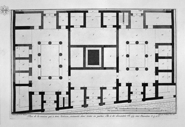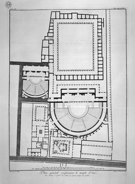 Curator: This is Plate XLV from the first volume of "The Roman Antiquities," an etching and engraving by Francesco Piranesi, after Giovanni Battista Piranesi, created around 1756. It presents a detailed plan of what was believed to be the upper floor of Caesar's Palace, attributed to Augustus. Editor: The image gives the immediate impression of complex geometries held captive within the frame. A stark, monochrome labyrinth, somehow both inviting and forbidding. Curator: It is fascinating how Piranesi uses the language of architectural drawing – the stark lines and lettered annotations – to evoke a lost world. Notice how the central courtyard, labelled "A," anchors the whole composition. That space would have been the heart of imperial power. Editor: Indeed, but observe the repetition of forms—rectangles, semi-circles, clusters of short parallel lines suggesting corridors. There’s a rhythmic, almost musical quality to it, even though it’s a functional plan. Do you think this emphasis contributed to how the palace would have operated, and been understood, at the time? Curator: The plan is less a purely technical document and more an exploration of memory and legacy. Consider how the arrangement of space dictates human experience and societal hierarchy. Each room, labeled with cryptic letters, hides untold stories of imperial life. We can only surmise its layout was meant to create a very specific relationship between occupants of the Palace. Editor: Agreed. Also note the stark contrast with the background—that opaque gray plane surrounding the main structure. That absence seems to speak to how utterly isolated these corridors and inner chambers must have been, like some echo chamber through which political strategy was transmitted from person to person. Curator: And perhaps underscores the psychological distance that emperors cultivated. Though grounded in classical history, Piranesi’s vision reminds us that architecture isn’t simply brick and mortar; it is a container for cultural identity. We understand how a culture might have developed around that type of architecture, simply through its forms. Editor: So this representation goes beyond a factual record of the architecture, but to make the very principles it was constructed on visible. It’s an aesthetic artifact in itself. Curator: Precisely! Piranesi is revealing a cultural dream, or nightmare, of imperial Rome through his meticulous and slightly fevered draftsmanship. Editor: A dark yet enlightening vision, then, of both past and potential, preserved for our contemplation through ink and paper.