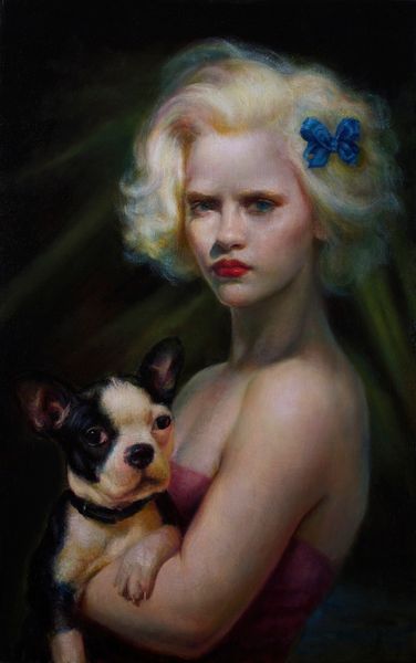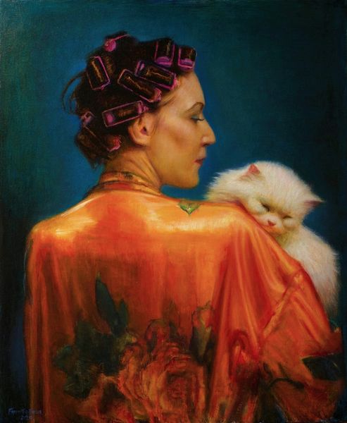 Curator: Looking at Rose Freymuth-Frazier's piece, a 2016 painting entitled "Safe Passage", what immediately strikes you? Editor: The quiet intimacy. It feels like a protective embrace, both tender and a little melancholic. The subdued lighting enhances that feeling of vulnerability. Curator: The title and the subjects absolutely play into that. It depicts a young person holding a cat around their shoulders, a posture that certainly evokes comfort. Looking closer, the context is a dialogue around shifting norms about animals, especially their integration into the nuclear family as emotional beings. Editor: Indeed, the cat acting almost as a familiar, guarding and observing with striking blue eyes. In many cultures, the cat symbolizes intuition, independence, but also a sense of mystery and the feminine divine. Curator: You bring up an interesting point. Consider that in the latter half of the 20th century, cats made their ways from domestic property to an equal companion, especially in Western families. Does that historical development alter how we view the subjects' poses here? Editor: Absolutely. It moves beyond mere companionship. The animal's presence offers psychological protection; a ward against the unseen, a spiritual companion during confusing times. It's very subtle, but potent, almost a subtle reimagining of the Madonna and Child. Curator: Right, that shift in domestic roles transformed public expectations and, by extension, depictions of interspecies bonds. The piece appears deliberately defying gender expectations as well. The figure presents androgynous features. This piece is inviting considerations for non-binary and gender fluid audiences, who have increasingly called for museum inclusion in the past decade. Editor: That’s insightful, the lack of strong gender signifiers definitely enriches the image’s open invitation to introspection. Ultimately, this image reminds me that safety isn’t merely the absence of danger. The artist delivers a timely commentary on evolving structures of safety in society through a canvas. Curator: And for me, it reinforces how representational artwork continues to evolve, to engage, and to reflect our ever-shifting understanding of connection and safety in an uncertain world.