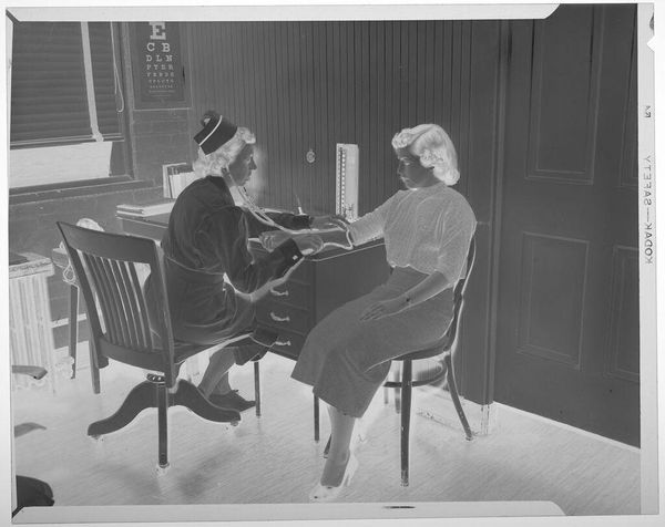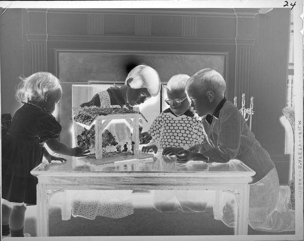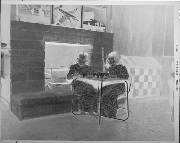 Curator: This snapshot, attributed to Lucian and Mary Brown, captures two children in high chairs, one feeding the other. Editor: It’s striking how the ordinary scene is elevated through the contrast of the grayscale tones. The textures of the wallpaper and the high chairs become almost tactile. Curator: Indeed, the setting suggests a shared meal, a ritual both domestic and social. The act of feeding becomes an intimate exchange, hinting at early power dynamics and social learning. Editor: Absolutely. The bare materiality of the chairs, the slightly worn wallpaper, all point to a specific time and place. I'm curious about the photographic process here, the printing. The image’s granularity lends an authenticity. Curator: I agree, there is an enduring quality to the image. It captures an ephemeral moment, and its significance is amplified by the cultural weight of domesticity and childcare. Editor: It reminds us that even the most mundane moments are constructed from labor, material, and the shared social act of being.