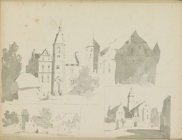 Editor: This is a sheet of architectural sketches, "Studieblad met versterkte gebouwen, mogelijk kastelen," created by Adrianus Eversen sometime between 1828 and 1897, using pencil. The drawings have a tentative quality, like ideas just beginning to take shape. What can you tell me about what you see in this piece? Curator: Well, these aren't just castles; they're like the daydreams *of* castles. I imagine Eversen, a bit of a romantic, perhaps, jotting these down after a long walk. It’s the kind of sketching you do when you're chasing a feeling, a memory of grandeur. What strikes you about their forms? Editor: Their variety, maybe? Each has a unique character, even in these early stages. Is it common to find so many distinct building designs within one sketchbook page? Curator: Absolutely! Think of it as visual brainstorming. He's exploring different possibilities, testing the waters. It is such a personal object – you see him, the artist, working through forms he loves. A glimpse into an architect’s heart, wouldn’t you say? Are they all successful? Editor: Maybe not, but they feel honest. I wonder what happened to them. Were they ever built? Curator: Maybe not literally in brick and mortar. Perhaps they morphed into something else entirely, pieces borrowed, lines re-imagined. An artist’s sketch often has more power, more truth, than any finished rendering. Editor: I hadn’t thought of it that way, a sort of artistic fossil. Curator: Precisely! The potential energy contained on one page. A joy.