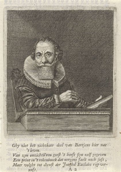 Editor: This print, “Geleerden rond een tafel,” or “Scholars around a table,” attributed to Jacob van Meurs and dating from around 1653 to 1662, is captivating in its detail. It depicts eight men seated around a table. The fine lines of the engraving create a sense of depth. What strikes me most is the formal arrangement. What do you see when you look at this print? Curator: Formally, the print is structured by a distinct horizontal division, cleaved by the planar surface of the table. This table serves as both a literal and figurative barrier and bond, unifying the portraits while distancing the subjects from the viewer. Notice the intricate rendering of textures - the varied facial hair, the fabrics. The artist has very skillfully exploited the limitations of the medium to maximise contrast. Editor: Yes, the rendering is amazing, particularly in how the clothing indicates social standing and how that's created through varying the hatching and the layering of the lines. The faces, however, have varying degrees of shadow and detail. Was this common practice in this type of work? Curator: The artist uses linear perspective and chiaroscuro, to suggest three-dimensionality, however, the even lighting suggests a somewhat flattened picture plane. In regard to the varying treatments, notice the distribution and direction of the lines and cross-hatching which is used strategically. It seems that more attention is paid to certain sitters, to bring their characters forward. What impression do you have of the character in the center? Editor: He appears dignified, almost regal in his attire. His gaze, though, feels rather severe, maybe because of how he has been rendered with strong outlines? This has been enlightening; thank you for sharing your perspective. I am seeing aspects of the image I hadn't noticed before! Curator: My pleasure. Paying closer attention to composition and technique allows for a richer appreciation of the printmaker's skill and intention.