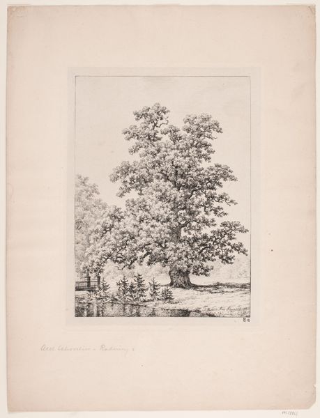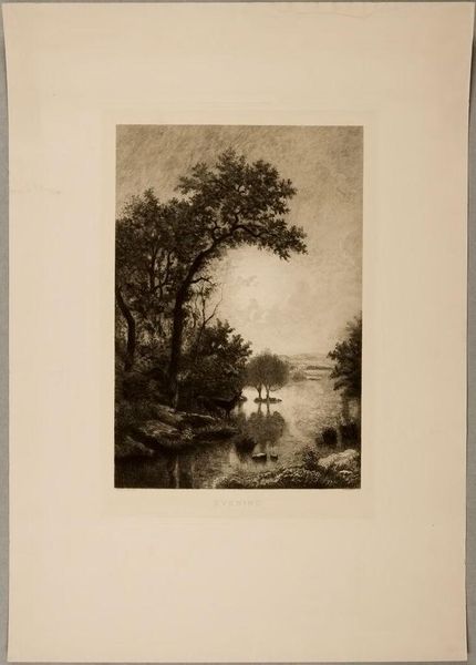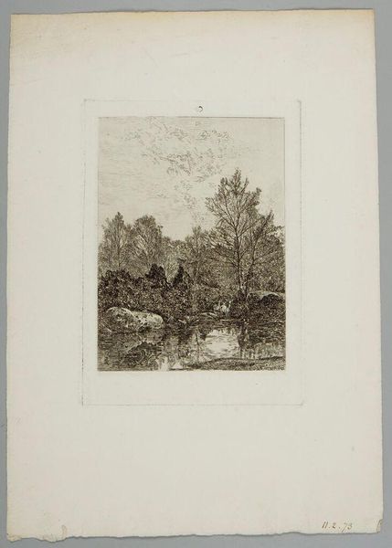 Curator: This is Charles Joseph Beauverie’s "Laundry Barge at Auvers (Oise)." Editor: It's quite somber, isn’t it? The density of the trees contrasts sharply with the open expanse of the water. Curator: Indeed. Beauverie, born in 1839, was working within a historical context of burgeoning industrialization. The barge itself is an interesting subject choice. Editor: The etched lines create an atmospheric perspective, almost blurring the distinction between the barge and the surrounding environment. The barge could be seen as an attempt to tame the chaotic scene. Curator: Perhaps, or perhaps the barge represents the common person making a living through simple means. Editor: I still read it as an intimate portrait rendered through the formal language of light and shadow. Curator: Both the social and structural aspects are interesting avenues for further exploration.