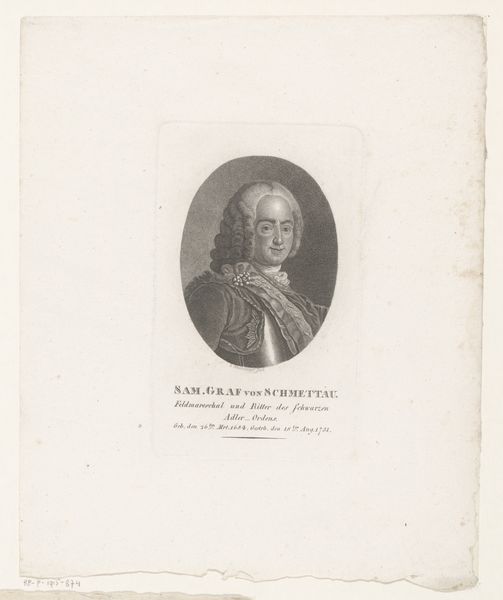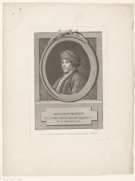 Editor: Here we have François Bonneville's "Portrait of Clemens XIV," an engraving from somewhere between 1796 and 1802. It's a rather stark image, a monochrome study of a man framed in a circle. What compositional elements strike you the most? Curator: The severe geometry is compelling. The circle in the rectangular field, the rigid lines of the sitter’s garments against the soft modeling of the face. The hatching used to define the volumes is meticulously controlled, creating a tonal range that’s subtle yet highly effective. Observe how the density of the lines shapes our perception, drawing us towards the face, particularly the eyes. Do you notice how the eyes invite you in? Editor: I do. They seem quite lively for an engraving. There's an unexpected depth created by the shading around them. Is that characteristic of neoclassical portraiture? Curator: The neoclassicists were particularly interested in the rational ordering of space. Observe the balance of light and shadow, how it creates a sense of order. In particular, the lack of emotional display, the controlled lines, these elements signal a turn away from the exuberance of the Baroque, toward a more "objective" mode of representation. Consider this "objectivity" not as neutrality but as its own kind of rhetoric. Is it succeeding? Editor: It certainly seems successful as rhetoric. The engraving projects an air of authority. It’s more about conveying the office than the personality of the individual. The choice to constrain him within that circle further reinforces that sense of containment and formality. Curator: Precisely. These formal elements articulate specific values. Through attention to structure and form, we decode how this image functions ideologically. It serves less as a window onto a person, and more as a monument. Editor: So, even without knowing anything about Clemens XIV, we can begin to understand what Bonneville and his contemporaries wanted to convey through this medium and style. Thanks for walking me through that! Curator: A pleasure. By examining these formal structures, we reveal their intricate web of meaning and ideological commitment.