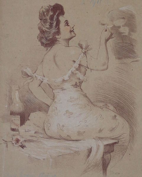 Curator: Foujita’s "Young Woman with a Mirror," painted in 1935, strikes me as incredibly intimate. There’s this soft, almost wistful mood hanging in the air. Editor: The surface texture itself communicates that softness you're feeling. You have to zoom in to appreciate that Foujita created this using delicate watercolour washes. It's subtle, really highlighting the texture of the paper. The process makes you think of other related “feminine” arts: costume and cosmetics, lace-making, the boudoir itself… Curator: It feels very Art Deco, almost surreal at the same time. Her gaze seems distant, detached. I get the sense of being both a privileged observer and somehow intruding upon a private moment. She's there, yet not fully present with us, if you know what I mean? Editor: And where *is* she? That manicured public garden reads a little like theatre flats. If this is genre painting, as our records suggest, I want to know, “What kind of life allows this moment of leisure?” How many unseen people produced her blouse, compact mirror, the pigments for the painting? Curator: Foujita had such a complicated relationship to both Japanese and European identity – in both spheres he seemed constantly self-constructing an “Artist” identity. So, I think he was playing around with surface and construction here – look at that somewhat cartoonish drawing within a drawing presented by the compact mirror, where the scene looks to be an urban architectural scape, as well as the buttons marching down her torso. It's like she's actively building an image of herself. Or several images? Editor: Right – not a stable representation but something more fleeting. The "caricature" element comes through more clearly now you point that out, but for me, the whole artwork suggests ideas about labor and how appearances function as a commodity, both for the artist and for his subject. How can we view her “essence” except as a production, a watercolour sketch, for mass consumption? Curator: Absolutely, I am struck by the idea of her self-representation in this captured instant of the 1930s. To me it is a bittersweet commentary on women and image construction in that era! Editor: For me, this makes me consider all the skilled, underpaid workers behind it, and makes me think about commodity itself. It's complex, this image, isn’t it?