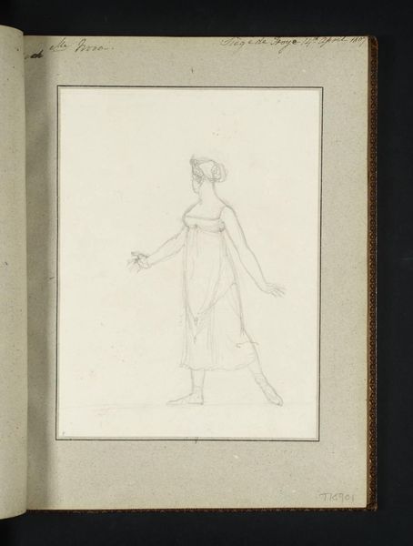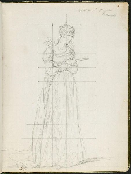 Curator: This is Jacques-Louis David’s sketch of Marie-Pauline Bonaparte, Princess Borghese, currently residing in the Harvard Art Museums. It is a pencil drawing measuring about 21 by 16 centimeters. Editor: It feels fragile, almost ephemeral. You can see the grid lines he used to construct the figure. It gives it a very calculated, academic feel. Curator: Indeed. David’s neo-classicism was, in part, a reaction to the perceived decadence of the aristocracy. This sketch, though unfinished, reveals the rigorous process behind portraying power. Editor: Yes, but look at Pauline's pose, the slight contrapposto, the way she holds the fabric. It’s all about conveying an ideal of beauty and status, even in this early stage. It reminds one of the Venus Pudica. Curator: And, of course, Pauline herself, as Napoleon’s sister, was a key figure in the construction of the Bonaparte dynasty's image, so David's work served an important political function. Editor: It is quite an insight into the way these images were crafted. Curator: It surely is.