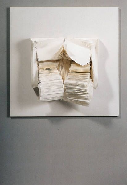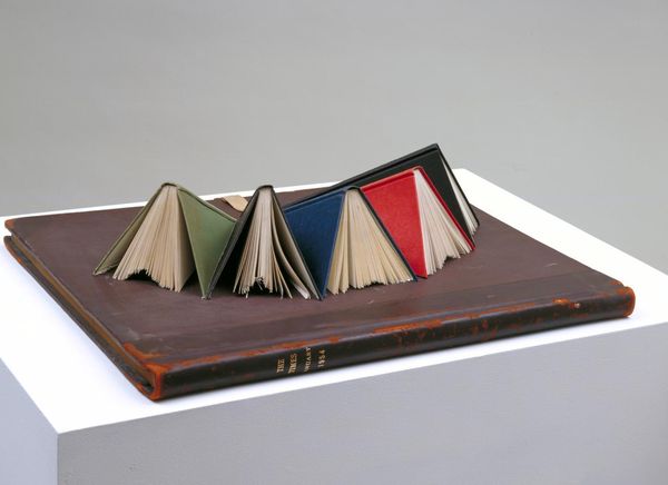 Curator: Standing before us is Ann Hamilton’s “Lineament-Ball,” created in 1994. The piece presents a deconstructed book and a ball of shredded paper, displayed within a vitrine. The juxtaposition is stark. What is your first reaction to this tableau? Editor: Immediately, a feeling of controlled chaos comes to mind. The crisp lines of the vitrine cage this… explosive disintegration of knowledge, perhaps? A violence done to language and form contained within very rigid borders. Curator: Yes, violence is a compelling way to describe it. I see echoes of ancient rituals here—destroying a text, as if to obliterate the very ideas contained within. Editor: Which connects directly to power. Who gets to write history, whose stories are told, and who is silenced or shredded? The book itself is opened up to the point that is just a frame without words, that to me indicates erasure or censorship. Curator: The hollowed book is incredibly symbolic, acting almost like a vessel. Consider its form: opened, but empty in its core. It might be interpreted as absence where there was supposed to be knowledge. I wonder if there's any intent on exploring gendered notions of who can be heard, a power structure indeed. Editor: Absolutely, and it seems heightened by the ready-made nature of it—taking everyday objects associated with intellect and labor, like paper and books, and turning them into something else entirely. What about the "lineament" aspect of the title? How does that connect? Curator: "Lineament" suggests outline, the barest framework. Perhaps Hamilton is suggesting we're left only with traces, that history is not this solid and unchanging thing but just faint marks fading away. She does this sort of thing across different artworks. This is a conceptual project on loss. Editor: That reframing from solid truth to fragile remnants really shifts my perspective on the piece. It becomes less about destruction and more about the inherent impermanence of information itself. That maybe language or a moment can become abstract really quickly. Curator: I think your point on the fragility of information rings very true here. It invites us to reconsider the power dynamics surrounding knowledge and its preservation, maybe even suggesting new futures or interpretations. Editor: Thank you for providing context, it has definitely expanded my understanding. I see the piece in an entirely new light!