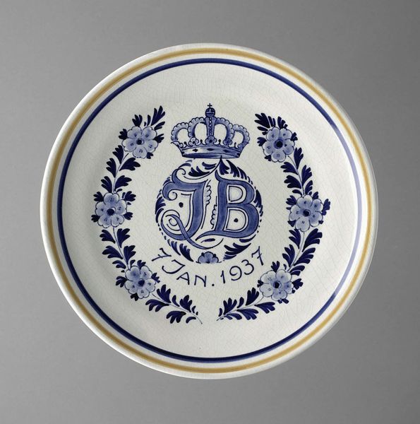 This blue and white earthenware plate was made in October 1934 by De Porceleijne Fles. At first glance, the striking clarity and symmetry evoke a sense of order. The monochromatic palette emphasizes form, inviting us to consider the structure of the plate itself. Note how the central image of the airplane, rendered in precise detail, dominates the composition. It's framed by a map of the world, underscoring the ambition of the London-Melbourne race. This juxtaposition of machine and map presents a visual metaphor for progress and connectivity. The surrounding text, integrated into the design, functions as both narrative and decoration, adding layers of meaning to the overall composition. The formal qualities of the plate – its shape, color scheme, and the arrangement of elements – all contribute to a larger cultural narrative around Dutch national pride and technological achievement.