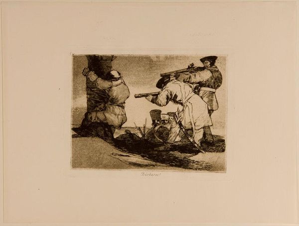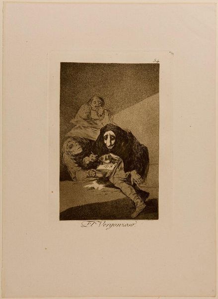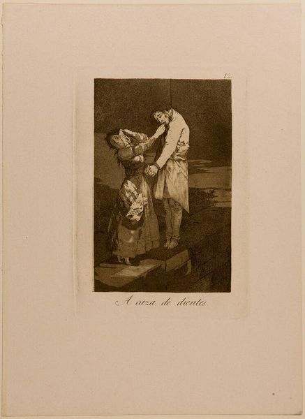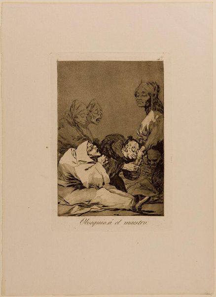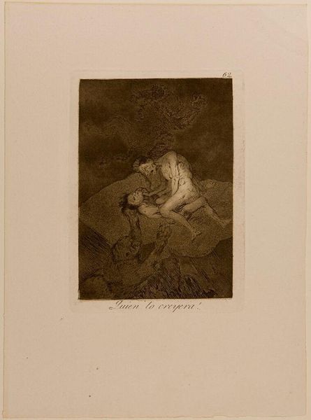 Curator: This is "They Carried Her Off!" by Francisco José de Goya y Lucientes, housed here at the Harvard Art Museums. The drama just leaps right off the page, doesn't it? Editor: It's undeniably tense. The stark contrast of light and shadow certainly amplifies the chaotic energy of the composition. Curator: Goya has such a knack for capturing the grotesque. I always feel a visceral reaction to his work, almost like a phantom limb recalling a nightmare. Editor: The aquatint technique lends itself beautifully to conveying the raw emotional charge. Notice how the dense tonal gradations evoke a sense of claustrophobia. Curator: It's a scene of abduction, or maybe even rescue, open to interpretation. I love how Goya leaves us to wonder about the story behind the image. Editor: Indeed. The ambiguity is precisely what makes it so compelling. The spiraling, almost vortex-like arrangement of the figures directs the viewer's gaze. Curator: Goya’s "They Carried Her Off!" is a piece that lingers in the mind, like a shadow, prompting us to question everything. Editor: A masterful display of chiaroscuro and dynamic composition, revealing a scene fraught with tension and narrative possibility.