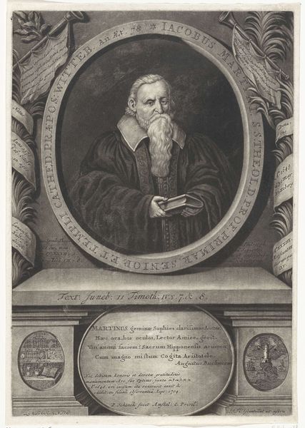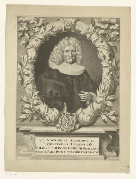 Curator: So, here we have Andreas Matthäus Wolfgang’s “Portret van Georg Bernhard Wibel,” an engraving, dating from somewhere between 1703 and 1737. Editor: Immediately, there's something captivating in the gravity of his gaze and the cascading white hair – it feels like encountering an Old Testament prophet, wise and weathered by time. Curator: An engraving captures details in such a fascinating way. Looking at the textures, consider the labor involved in creating these lines, the tooling, the pressures applied to the plate… each stroke deliberate, creating tone and depth from tiny marks. Editor: And look at those minute inscriptions that frame the portrait! To consider the level of craft, dedication and skill required fills me with such reverence. What secrets are encoded in his eyes and etched within those curls? It feels like a riddle wrapped in silver ink. Curator: Yes, exactly, Wolfgang likely used burins, small hardened steel rods that when dragged across a metal plate, lift sharp metal shavings which create the recessed lines into which ink will settle. It's fascinating how these fine lines coalesce to build a personality, isn’t it? I'm particularly struck by how he renders the ruffled collar and the play of light across the subject’s face. Editor: Speaking of faces, I cannot take my eyes off this Georg’s stern, but kind face, he looks as though he carries untold stories in his eyes... Also, those plump cherubs holding a laurel wreath, and an engraved family crest—the details feel so carefully constructed. Almost staged to represent status and intellectual pedigree. Curator: Portraits like this were, after all, carefully constructed statements. They were meant to convey particular messages about the sitter’s status, character, and affiliations. A way of controlling a particular man's social persona, making sure posterity got the picture. Editor: Indeed. When you consider the physical and cultural labor, you have a piece with multiple layers of craftsmanship; from the sitter who embodied the character, to the craftsman who painstakingly translated that onto metal plate. Curator: And so, in examining this print, we not only appreciate Wolfgang's skill but also the intricate web of production and symbolism embedded within this Baroque era artwork. Editor: Yes, a remarkable artifact and reflection of not just a man, but also an entire mode of production and period.