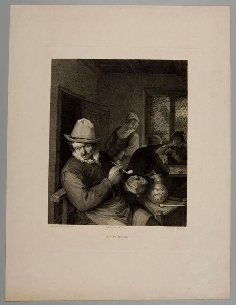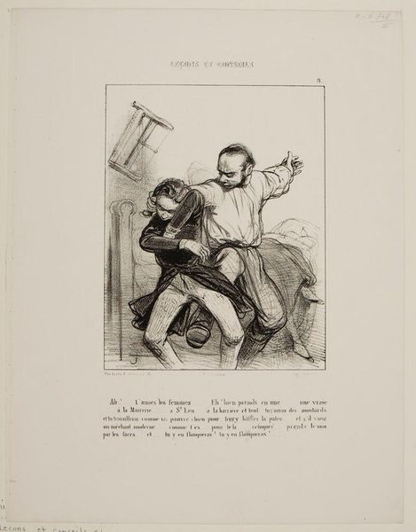 Curator: This is a lithograph by Honoré Daumier, titled "Let's see...open your mouth!..." held at the Harvard Art Museums. It's undated, but likely from the mid-19th century. Editor: The palpable anxiety radiating from the seated figure is immediately striking. It's a brilliant depiction of dread. Curator: Absolutely, Daumier was a master of social commentary. This image likely critiques the often-unpleasant experience of medical examination, especially the power dynamics between doctor and patient. Editor: The dentist figure looming over the patient, implement in hand, it conjures up the fear surrounding these medical treatments. You can read the cultural fear of the medical profession in his face. Curator: Precisely, dental care in that era wasn't what it is today. Daumier's caricatures often exposed the vulnerabilities and absurdities within societal structures. Editor: The composition cleverly uses the figures' postures and facial expressions to highlight vulnerability and the psychological toll of seemingly simple procedures. It also underscores the continuity of our anxieties about healthcare across the ages. Curator: It is a potent reminder of how anxieties surrounding healthcare have long been depicted and satirized. Editor: Indeed, it certainly adds another layer of appreciation for the artwork.