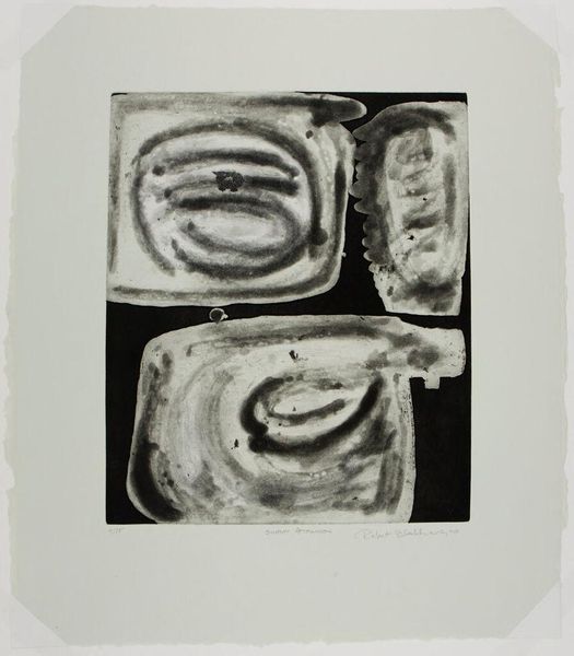 Editor: So, this is Jacques Le Marechal's "Untitled" intaglio print. The black and red hues really strike me, creating a stark contrast between the abstract imagery in the upper and lower registers. It's quite enigmatic, and the combination of textures is so interesting! What do you make of it? Curator: I see it as a commentary on the social construction of identity. Notice how the portrait aspect in the upper register seems to be dissolving into abstraction, almost a self-deconstruction. What societal forces do you think might drive an artist to deconstruct self-identity in this way, especially considering that prints often had an objective to create multiples and engage a broad public? Editor: That’s interesting... The choice to use abstraction makes me think about evading labels or resisting expectations from viewers or the art market at large. Is that possible in the market for prints? Curator: Absolutely. Consider the social and political context the artist was operating in. Who gets to be seen, represented, and remembered has historically been linked to systems of power, and perhaps the abstraction serves as a form of resistance. Do you feel the red in the bottom register has symbolic weight to its tone in particular? Editor: Definitely! It adds intensity, a sense of passion or maybe even a violent undertone with the stark abstract insect or sunlike figure! Is that something printmakers engaged with commonly at this time? Curator: Printmakers often leverage color symbolism and layering techniques, especially in intaglio, to enhance meaning, and to increase cost on multiple runs for sale, yes! I am interested in how the layers in the medium affect our experience of portraiture and abstraction. Thank you, I am always seeking to find how the public makes their own new associations to the materials at play! Editor: It's amazing how much history and thought can be embedded in a single print. I will certainly ponder how I create work myself moving forward with our discussion in mind.