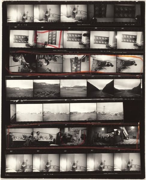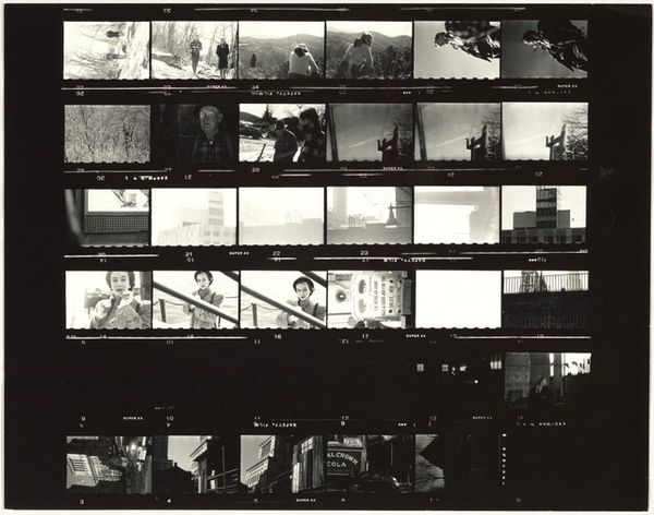 Robert Frank's photographic film strip, Guggenheim 412--Los Angeles, presents a stark, grainy sequence that captures fragments of American life. Dominating the visual field are towering oil derricks, symbols of industrial ambition and environmental imposition. These structures, reaching towards the heavens, recall the Tower of Babel, a testament to human hubris, yet also echo the aspiration inherent in cathedral architecture. The hand motif, repeated throughout, acts as a gesture of control, perhaps reminiscent of divine intervention in Renaissance paintings, but here, it is implicated in the act of manipulating and obscuring reality. The film strip format itself evokes a sense of fleeting time, much like the unrolling of history or the frames of a dream. The high-contrast black and white lends an air of nostalgia and melancholy, underscoring the psychological tension between progress and its discontents, a recurring theme in the collective cultural memory of the 20th century.