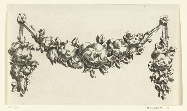 This is a print made by Francoys Dancx in the 17th century, showcasing a festoon richly adorned with fruit, a visual motif with roots stretching back to antiquity. The arrangement of fruits is not merely decorative; it speaks to deeper cultural values. The abundance of fruits, including the prominent lemon, symbolizes prosperity and divine favor, echoing themes found in Roman mosaics and Renaissance paintings alike. Consider, for instance, how garlands of fruit were depicted in ancient Roman art to celebrate seasonal cycles and abundance. The inclusion of a lemon is particularly intriguing, given its association with medicinal properties and, at times, even love and fidelity. These symbols have a curious habit of resurfacing. This continuity reveals something profound about our collective memory and the enduring power of symbols to communicate across generations. The festoon, then, becomes a vessel of cultural memory, its fruits ripe with history and meaning.