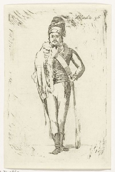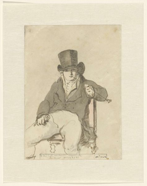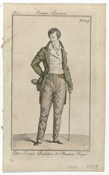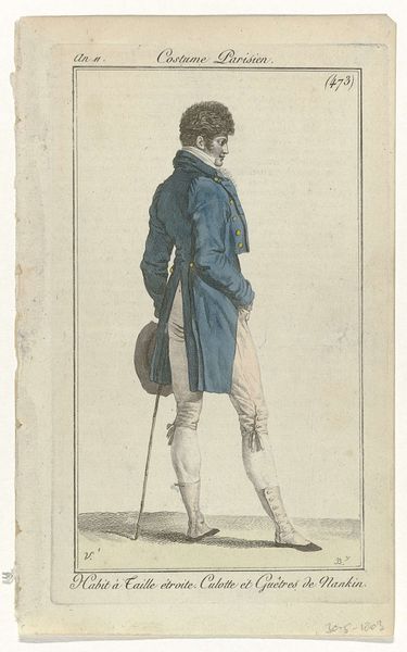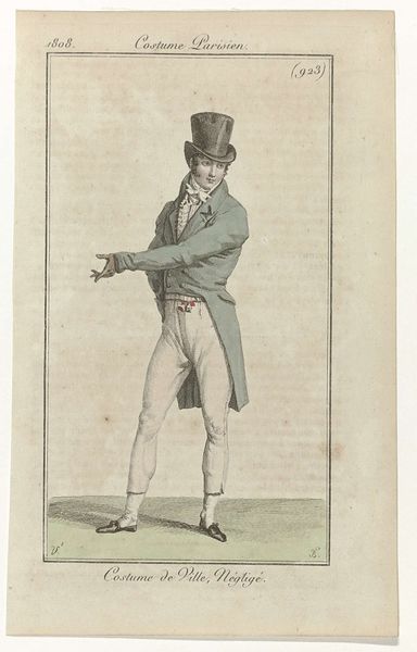 Pierre Charles Baquoy created this print, "Costume Demi Habillé," in 1807 using etching and engraving. These processes involve covering a metal plate with a waxy, acid-resistant coating, drawing through the coating to expose the metal, and then bathing the plate in acid. The acid bites into the exposed lines, creating grooves that hold ink. Look closely, and you can see how the sharp, precise lines define the figure's clothing and posture. The etching technique captures the textures of the fabrics, from the smooth finish of the top hat to the folds of the jacket. The print’s existence speaks volumes about the fashion industry of the time, revealing the labor-intensive process of textile production. Prints like these were instrumental in disseminating fashion trends, influencing what people wore and, by extension, fueling the demand for textiles and garments. This image isn’t just a static representation; it’s a snapshot of a complex economic and social landscape. Appreciating this artwork means recognizing the labor and materials involved in creating both the print and the clothes it depicts.