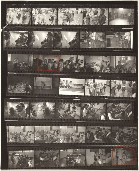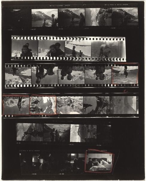 Editor: We are looking at “Edouard Boubat--Paris 17,” a 1959 gelatin silver print by Robert Frank. It's a contact sheet, presenting a sequence of images rather than a single composed photograph. I’m struck by the fragmented narrative. How do you interpret this contact sheet format? Curator: Consider how the contact sheet itself functions as a modern icon – a direct trace of the artist’s process and choices. The visible sprocket holes and manufacturer markings— "DuPont Safety"—these aren't imperfections, but clues. They point us to the materiality of film, to the physical reality underpinning the image. What stories do these seemingly random images suggest when viewed together? Editor: I see glimpses of Parisian life. There's a man in a suit, some trees in a park, what looks like a couple in a restaurant, some architectural details of a stone arch with hats underneath, and then a figure on display, encased, horizontal, and in low-lit space. They almost feel like disjointed memories. Curator: Precisely. Note the repetition of certain motifs - the recurring figure, the suggestion of confinement. What does that repetition evoke for you? Does it speak to themes of identity, observation, perhaps even mortality? Think about the symbolic weight of a “negative,” and consider what it tells us when Frank elects to present a full record instead of just the "perfect" shot. Editor: I see, so it’s less about the specific subjects and more about how they weave together – or perhaps resist weaving together. Curator: Exactly! This is the artist showing us that images contain memory and loss. The frame and editing, visible and unveiled, invite us into the subjective experience. Editor: I appreciate your insight on Frank’s perspective by exposing the "frame." It emphasizes how photography interprets reality versus simply reflecting it. Curator: Yes, a lens to consider what truths may surface as he decides what to hide and what to reveal.