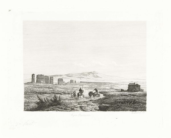 Curator: John Austin Sands Monks created this etching, "View of Athens with the Parthenon." Editor: It feels so serene and almost melancholy—the monochromatic palette and the open space evoke a sense of quiet contemplation. Curator: Monks lived through rapid industrialization. His choice to depict an ancient site speaks to a yearning for a simpler, perhaps more idealized, past. Editor: The composition is striking; the contrast of the detailed ruins against the vast, empty foreground really directs your eye. The etched lines provide a lovely textural quality. Curator: Etchings like this one played a role in shaping public perceptions of Greece, especially during the rise of philhellenism and classical studies. Editor: It’s a small piece, but its evocative power and skillful rendering make it so compelling. Curator: Indeed, a miniature window into a world steeped in history and cultural significance.