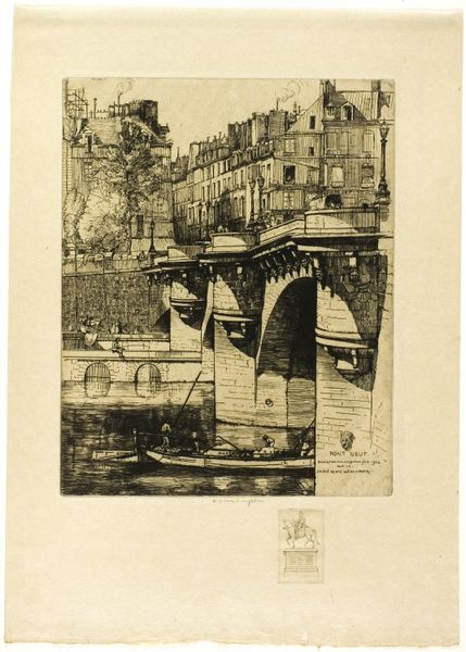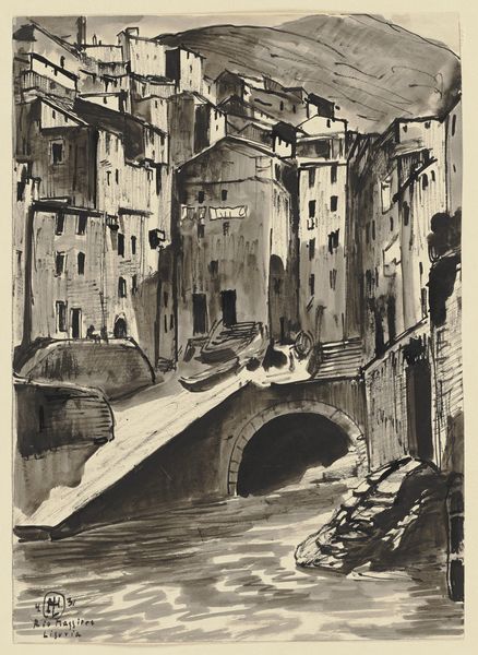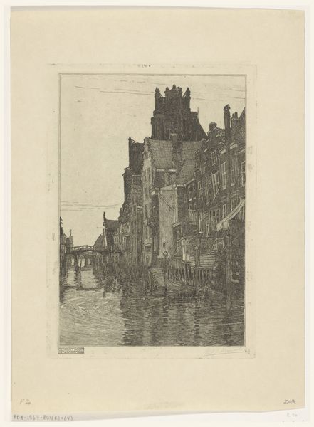 Editor: So, this is Willem Wenckebach's "De Beuling Sluis te Amsterdam," made sometime between 1870 and 1926. It's a drawing and print made with ink on paper. The narrow cityscape, especially the reflections in the water, are mesmerizing, almost dreamlike. How do you interpret this work? Curator: The dreamlike quality you observe invites us to consider Amsterdam, and urban environments more generally, not just as physical spaces but as social constructions reflecting power dynamics and lived experiences. Consider how the narrow perspective might represent the constricted opportunities for certain populations within a rapidly industrializing city. Who gets to navigate those streets freely, and who feels hemmed in by the city's structure? Editor: That's interesting, I hadn't thought about it in terms of social stratification. The reflection in the water almost creates another world—is that relevant? Curator: Absolutely! Water has long been used as a symbolic element, representing the unconscious, fluidity, and also—importantly, in the context of a port city like Amsterdam—commerce. Do you think Wenckebach is perhaps making a statement about the flow of capital and its impact on the lives of Amsterdam's citizens? Is the reflection a distorted version of reality? Editor: It does seem a bit murky. Almost like something's being hidden. I see what you mean about power dynamics too. You can't even see people except for those small figures in the distance. It makes you wonder about their place in it all. Curator: Exactly! By focusing on the infrastructure rather than the inhabitants, Wenckebach subtly directs our attention to the structures that shape human experience. What narratives might be obscured when we only focus on the canals and buildings? Editor: I think I get it. It’s more than just a pretty picture of Amsterdam. It speaks to the unseen forces at play within the city. I'll never look at cityscapes the same way! Curator: Wonderful. And it illustrates the exciting possibilities that emerge when we start reading art through the lenses of social history and critical theory.