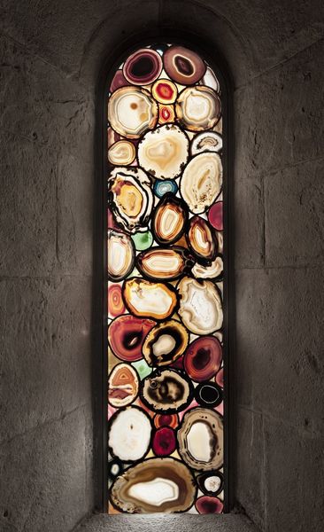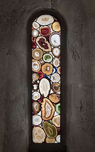 Editor: Here we have Sigmar Polke's "Ahatfenster," created in 2009. It's a window made of agate, creating this stunning mosaic of natural forms. What strikes me is how modern and ancient it feels at the same time. How do you interpret this work? Curator: The power of Polke's work resides, in part, in his playful yet profound juxtaposition of materials and meanings. Using agate, a stone with inherent patterns and geological history, Polke taps into cultural memory, echoing the artistry of stained-glass windows found in cathedrals, which serve a sacred purpose. Look closely: what emotional or spiritual associations are conjured through the colors, textures, and light transmitted? Editor: I see that juxtaposition now! Agate feels so earthy and grounded compared to the heavenly light usually associated with stained glass. The light filtering through gives it almost a warm, bodily feel rather than a divine one. Curator: Precisely! It’s a brilliant subversion, wouldn’t you say? The architectural setting amplifies these conflicting associations of the organic and the sacred, almost acting as an invitation to question how nature and spirituality are often portrayed as different worlds. What do you think this subversion could symbolize? Editor: Maybe it's about finding the divine in the everyday, in the natural world itself, not just in religious institutions. This reframing makes me appreciate how everyday materials can offer profound spiritual insight. Curator: I agree. And, the beauty lies also in how these cultural references aren’t necessarily set in stone, pardon the pun. Every beholder could extract varied nuances, influenced by individual experiences. That is its genius. Editor: I love that: finding cultural links and varied symbolic messages and the role that nature can play within those spaces. Thanks!