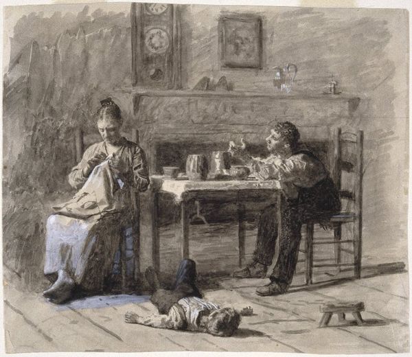 Curator: Alexandre-Gabriel Decamps' work, evocatively titled "Dog Leaving His Niche," offers a fascinating study in light and shadow. Editor: Yes, I immediately noticed that interplay. It gives the scene a rather somber, almost theatrical quality, doesn't it? Curator: Indeed. Consider how Decamps has deployed chiaroscuro to sculpt the forms, drawing the eye from the children huddled in the corner to the canine emerging from its shelter. Editor: The niche itself seems almost like a stage set. It's interesting how Decamps uses this animal scene to reflect broader social realities. It feels imbued with the vulnerability of marginalized communities. Curator: Perhaps, but I'm more intrigued by the formal arrangement—the geometric interplay between the architecture and the organic forms of the figures. It establishes a visual rhythm. Editor: It's hard to ignore the historical context though. The way Decamps positions these figures reflects the societal attitudes of the time. Curator: Ultimately, both the formal and cultural readings enrich our appreciation. Editor: Precisely. It gives us insight into the artistic conventions and the human experience that inspired Decamps.