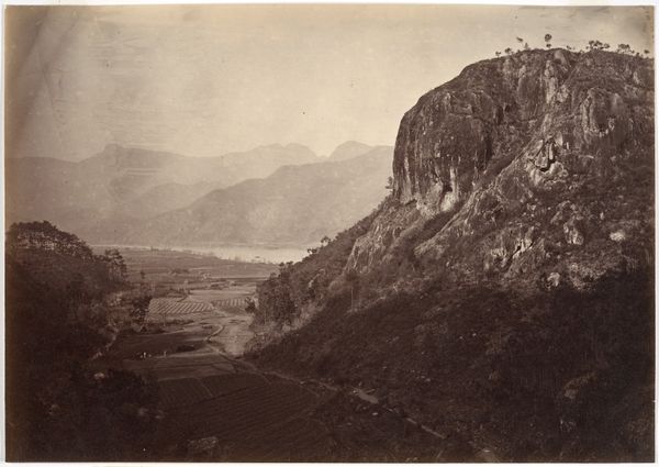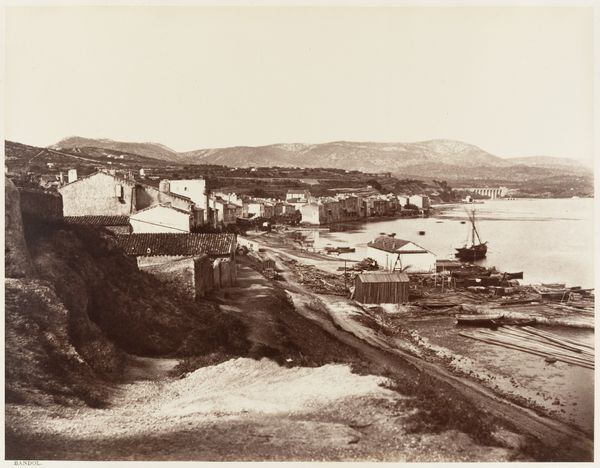 Curator: Here we have an albumen print titled "Gezicht op Monaco met rechts de oude vestingstad en op de voorgrond een treinstation," which roughly translates to "View of Monaco with the old fortified city on the right and a train station in the foreground," created around 1890-1900 by Étienne Neurdein. Editor: My initial impression is this photo oozes faded grandeur. The sepia tones just bathe everything in a nostalgic light, like a forgotten postcard from a well-to-do uncle’s European tour. Curator: Indeed. Albumen prints like this, which were hugely popular, were made using egg whites to bind the photographic chemicals to the paper. It speaks to the industrialized processes making photography accessible but also, consider the sheer number of eggs… the means of production involved a whole network. Editor: Eggs! Can you imagine how many omelets could have been made instead? But you are right. The composition, divided so clearly into layers – foreground’s railway, midground city, distant sea—gives me a sense of ordered societal stratification. You have the transit, the population, and then…the escape. Curator: That stratification is literal as well as societal, of course. Notice how the fortress looms over the rest, a sign of control and authority, yet rendered so picturesque by the technique. The building of cities required materials, labor, trade… each photograph representing consumption as much as it does art. Editor: It feels simultaneously factual and fantastical. Look at the textures created, where the focus isn’t uniform, softening details. It lends a painterly quality, blurring the line between a document and dreamscape. Plus, I can almost smell the sea air, feel the heat rising off those stone buildings… or maybe that's just my own longing for a fancy getaway talking! Curator: That's the persuasive charm of images of leisure—part of their mass appeal at the time, which persists today. Seeing this photograph through a material lens makes us think about both the process of making images but also the broader industrial landscape in which they were created and consumed. Editor: Absolutely. Now I'm wondering about who would be looking at it. Daydreamers? City planners? And were they all hoping to get lucky at the casino? Maybe these images hold all the things you were talking about but were used by everyone in so many different ways!