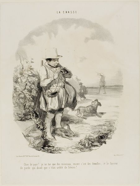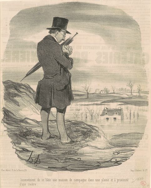 Curator: Ah, look at this, from 1847: Honoré Daumier's lithograph, a print called "Désagrément d'aller a la pêche…" Or, roughly translated, "The Discomfort of Going Fishing." Editor: Discomfort is putting it mildly. He looks absolutely appalled! Is he pulling up…a wad of old socks? The texture he's managed to create is incredible! Curator: Daumier was a master of capturing human foibles. Observe how the "catch" disrupts the idealised landscape, it underscores the tension between Romantic expectations of nature and the lived reality. Fishing, like art itself, doesn’t always yield the beautiful image we expect. Editor: I see this drawing, and I immediately think of those Renaissance paintings of cherubic children holding up dead birds, only this is a more grotesque, darkly humorous take. The cloud of tiny scribbles surrounding the man's catch looks like an angry swarm of, well, discomfort. It's fantastic. Curator: The swarm visually echoes the political unrest of the period; Daumier used caricature to critique societal norms and political figures. He found ways to externalize social tension, didn’t he? It’s worth noting the dark underbelly of Romanticism's individualism in times of struggle. Editor: Totally. This isn't just someone being annoyed they didn't catch a fish. This is about the broader experience of disenchantment, the sense that what we expect versus what we get is often ridiculously far apart. The fellow in the drawing looks as if someone promised him transcendence on the riverbank, and instead, all he got was moldy rags and a bad smell! Curator: Precisely, Daumier reminds us of the fragile border that distinguishes aspiration and disillusionment by mocking social aspirations. The man wanted a idyllic painting of nature—but only found squalid reality! Editor: What's also remarkable is how quickly he sketches all this in just a few strokes. He perfectly catches the character’s expression! He is clearly disappointed and exhausted by failed hopes. This makes me think about how much humor there can be within personal letdowns and disappointments. Curator: Indeed, perhaps humor and self-awareness is exactly what can allow people to overcome those hurdles in real life. Editor: A little humor, a little humility, and maybe a good pair of gloves, just in case the "catch of the day" is more unpleasant than palatable. I think that's a great note to end on.