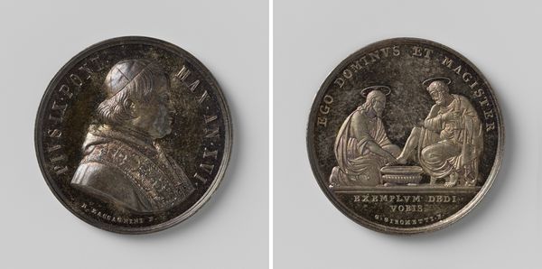 This medal was made in 1803 by Johan George Holtzhey, likely from silver, to celebrate the twenty-fifth anniversary of the Dutch National Household Society. The material itself, precious and weighty, speaks to the societal importance of the organization. Holtzhey was a master die cutter, a highly skilled craftsperson responsible for creating the metal stamps used to mint coins and medals. This medal would have been made through a process of careful engraving and striking. Consider the precision required to create such small, legible lettering and detailed imagery. On one side, a tree grows, surrounded by agricultural tools, symbolizing prosperity and growth. The other side features an altar with rays of light, representing enlightenment and progress. Medals like these were not just commemorative objects, they were tools for shaping public opinion and celebrating civic values. The artistry and material value elevated the status of the organization, aligning it with notions of national pride and economic stability. It's a testament to the enduring power of craft in shaping our understanding of history and society.