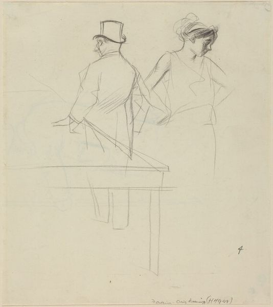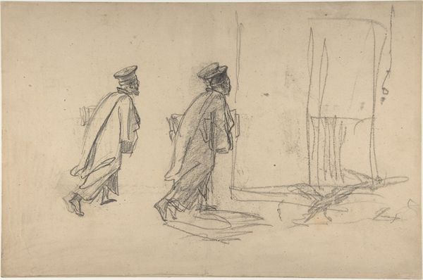 Curator: This is Jakob Nussbaum’s pencil sketch, Soldaten auf die Front sehend, created in 1916. Editor: There’s such a raw, unsettling bleakness to it, even with its sparse lines. It speaks volumes about the mental state of these soldiers, turning away toward a distant horizon. Curator: Indeed. Nussbaum's handling of line is fascinating here. Notice how the intersecting diagonal strokes define the volume of their jackets and legs. They’re delineated with incredible economy. Editor: And the way those lines are employed emphasizes a world on the brink of collapse, doesn't it? The subtle distortions and angularity hint at a psychological unease mirroring the fractured realities of war and masculine identity, echoing concerns raised by early feminist writers about the glorification of military conflict. Curator: I see your point. There is a distinct lack of symmetry that heightens the expressive impact of this study. We should also note the horizon line itself, that implied divide... how it underscores the compositional balance while creating tension. It anchors the two figures while paradoxically emphasizing their alienation. Editor: Absolutely. Placing them in this limbo reflects a Europe grappling with itself. They seem robbed of individual agency, reduced to cogs within a military apparatus indifferent to human suffering and reflecting back the power structures inherent in society. Curator: The visual tension you describe might also stem from how little tonal variation exists. It keeps us lingering on the formal structures and patterns themselves. Editor: Though its simplicity can initially deceive, this deceptively uncomplicated sketch resonates deeply when we contextualize it. It urges us to delve beyond the formal components and to actively reflect on both the human trauma and political contexts that inform its making. Curator: It is indeed a confluence of aesthetics and pathos. Nussbaum compels a powerful reaction even within these modest parameters. Editor: By unveiling those intersections, it provokes vital discussion that still informs our present.