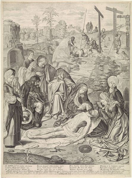This image, titled "Graflegging van Christus," was made anonymously around 1580, using the technique of engraving. Engraving is an intaglio process, meaning the image is incised into a surface – here, a copper plate – and then filled with ink. The plate is then pressed against paper, transferring the image. This technique demands meticulous skill and planning. The engraver uses a tool called a burin to carve lines into the metal, controlling depth and spacing to create tonal variations and intricate details. The resulting print is a testament to the engraver's hand. Each line carries the weight of intention, contributing to the overall emotional impact of the scene, which depicts the deposition of Christ. The cross-hatching, used to create shadow and volume, speaks to countless hours of focused labor. This was no quick sketch, but a carefully constructed image, intended to convey the gravity of the subject. By attending to these methods and materials, we can better understand the historical and social context in which this print was made, as well as the artistry and skill involved in its creation.