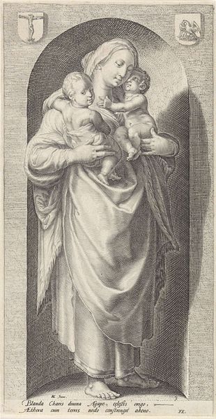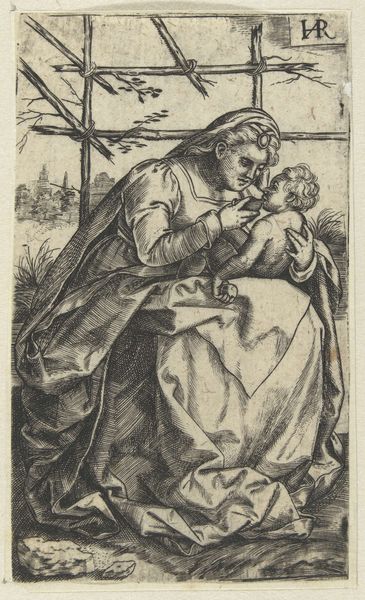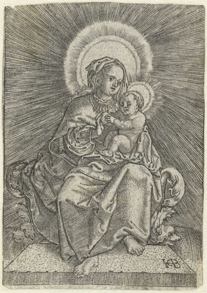 This engraving of Maria and child on a crescent moon was created in 16th century by Monogrammist AH. Radiating lines of light emanate from behind the Virgin, whose figure dominates the composition. The artist uses a series of intricately placed lines to create tonal variation throughout the work. Note how the lines are not merely descriptive; they construct the figures and their voluminous garments. This meticulous mark-making imbues the image with a palpable sense of texture. This creates an almost tactile experience as the Virgin’s drapery seems to fold and flow with a life of its own. Standing on the crescent moon, Mary, with the Christ child, represents the Woman of the Apocalypse. This is laden with symbolic meaning, reflecting contemporary religious and philosophical ideas about divinity and salvation. The formal elements here function to communicate complex theological concepts in a visual language. In its totality, this engraving opens a space for considering how artistic techniques intersect with cultural and religious meanings.