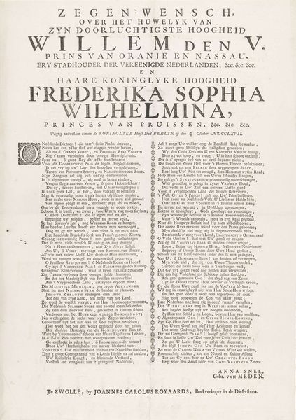 Curator: What a fascinating piece! We're looking at "Vreugdecourant bij de 43ste verjaardag van prinses Wilhelmina Frederica Louisa, 1794," possibly dating from 1794-1798. This engraving, currently held in the Rijksmuseum, offers a glimpse into Dutch society at the time. Editor: My eyes are immediately drawn to the density of text! It feels more like a proclamation or news bulletin than a portrait. There’s an almost overwhelming seriousness emanating from the finely wrought lettering and design. Curator: Indeed. As a materialist, I appreciate how the engraving process allowed for mass dissemination of information and imagery. These prints were essentially the newspapers of their day, shaping public opinion and celebrating significant figures like Princess Wilhelmina. Editor: Exactly! This wasn't just a commemorative object, but a vehicle for constructing an image of royalty and broadcasting it widely. Think about the labour involved in its production – the engraver's skill, the paper maker, and the distribution networks that carried this 'news' across the land. Curator: You’re spot on. And as an artist, I also see a layered approach. The cherubic figures at the top, for instance, contrast with the block of text. This layering creates tension and pulls me into the print—but, in terms of that tension, is this purely celebratory, or are there other tensions we should be looking for in late 18th Century Dutch society? Editor: It’s tempting to see only celebration on the surface. But placing the print within its social context raises important questions. Was the depiction of Wilhelmina simply propaganda or did it hold real currency and connection within that wider world? I wonder how access to, and opinions regarding the princess were formed with such ephemeral items that would get worn by time. Curator: These material remnants offer valuable insights into how the process of producing "images" has changed. With something as simple as this, in some senses a precursor of news printing as well, these portraits are testaments to an artistry outside "High Art," right? Editor: Precisely. By exploring the production and distribution of such an object we might find deeper meaning in it than by seeing the surface-level appearance of a mere ‘commemorative portrait'. Curator: It reminds us how art and artifacts of popular culture offer so many insights and stories beyond first appearances, inviting deeper dialogues between makers, viewers, and subjects through touchstones of our common cultural understanding. Editor: Absolutely; It makes you consider the labor and artistry involved in conveying these historical portraits to an interested viewership—then and now!