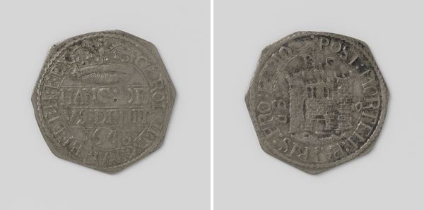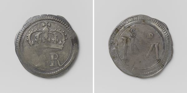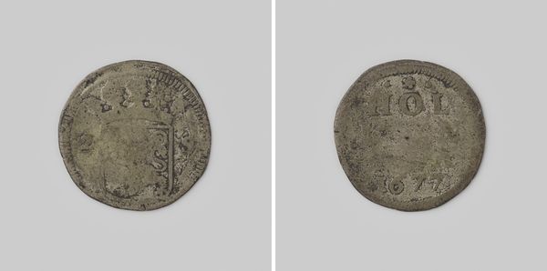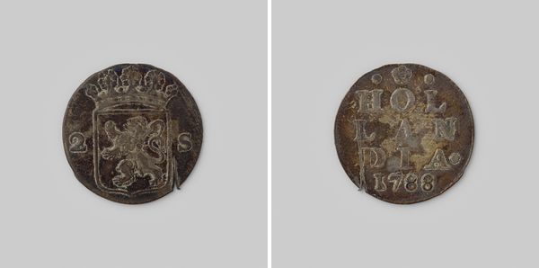 Curator: Up next, we have a fascinating artifact from 1732: a "Hollandse dubbele stuiver" from the Dutch province of Holland, now held in the Rijksmuseum's collection. Editor: It's small, isn't it? Almost easy to miss. You immediately see the wear, the fingerprints of commerce on its pitted surface. Makes you wonder about all the hands it passed through. Curator: Exactly. And consider its purpose. It wasn't just currency; it was a proclamation of Holland's economic power in the Dutch Golden Age. Each coin disseminated political imagery into the hands of the populace. Editor: Tell me about that imagery. I'm seeing a rampant lion and a crown on one side. I imagine the material composition of this particular metal piece was also vital to the message. Curator: Absolutely. The lion is the symbol of the province of Holland, asserting its strength. And "HOLLANDIA" is emblazoned clearly, making its origin unmistakable. But to your point about materials, silver in coins wasn’t just about monetary value; it spoke to wealth and stability in international trade. Editor: Right, it embodies labor—from mining and smelting to the artistry of the engraver, to its function in tradesman's and farmers’ transactions. It shows a connection between Holland and the global extraction of resources during the time of their extensive international businesses. What type of statement was it for Holland to display it in a time like this? Curator: I think in a time where currencies and political boundaries were frequently shifting, displaying "HOLLANDIA" prominently served as an essential tool for consolidating regional identity and asserting its sovereignty and economic stability amidst international trade complexities. Editor: I get a stronger sense now of how much meaning and activity this little object has facilitated. It's amazing. Curator: Isn't it? I love how a single coin can be so telling about an era. Editor: Absolutely, it bridges the gap between finance, craft, and political history. It's definitely not "just" a coin.