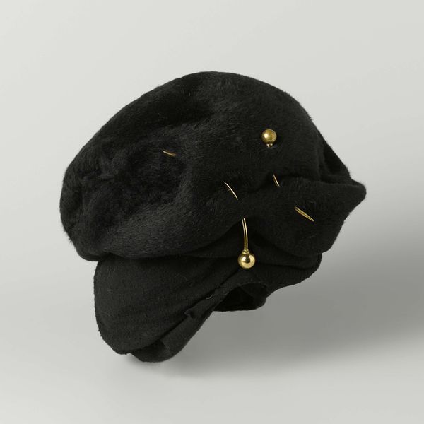 This felt hat with feathers and ribbon by Suzanne Talbot is a little symphony of textures and muted, earthy colours. You can see the hand of the artist clearly in this piece - the felt is soft, almost like a painting surface, and the feathers are carefully arranged, each one a little brushstroke of nature. The dark brown feathers at the top create an upward surge, a dramatic flourish against the more subdued green of the felt. Then, just when you think you've got the color story figured out, there's this pop of yellow-green feathers near the base, like a playful disruption of the established order. It's easy to see echoes of the Vienna Secession in this hat - think of Klimt and his opulent use of materials, or Schiele's ability to imbue objects with psychological depth. Like them, Talbot seems to be saying that art isn't just about representation, it's about transforming the mundane into something extraordinary.