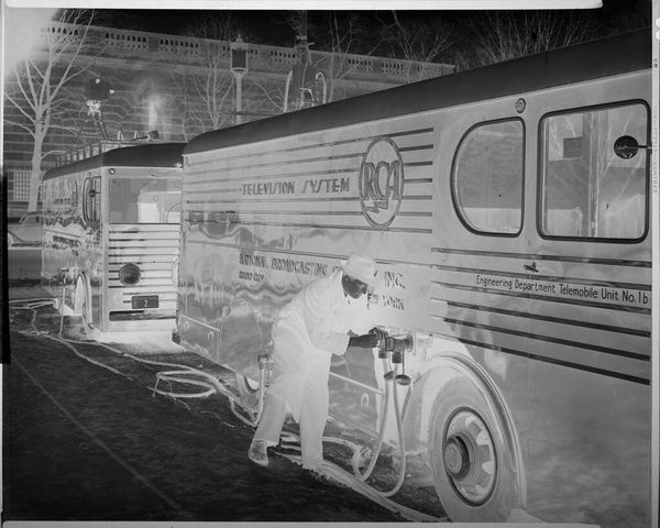 Curator: This gelatin silver print by Jack Gould, housed here at the Harvard Art Museums, captures three firemen coiling a hose into a firetruck. Editor: There's something almost ghostly about it, like a memory fading. The inverse tones amplify the everyday heroism, don't you think? Curator: Absolutely. The light and shadow play creates a powerful sense of duty and vigilance. Firefighters, throughout history, are seen as protectors, linking them to ancient guardian figures. Editor: The coiled hose, ready for action—it's a symbol of preparedness, but also a kind of vulnerability, hanging there. It all just feels so human, so immediate, despite the photographic process. Curator: The image resonates with our primal need for safety and order. These firefighters, in this moment, represent the archetype of the rescuer, selfless and ever-ready. Editor: It’s funny, isn't it? This small photograph encapsulates such big ideas about community and courage, all in the mundane act of coiling a hose. Curator: It invites us to reflect on the ordinary moments where extraordinary acts of service and bravery are born.