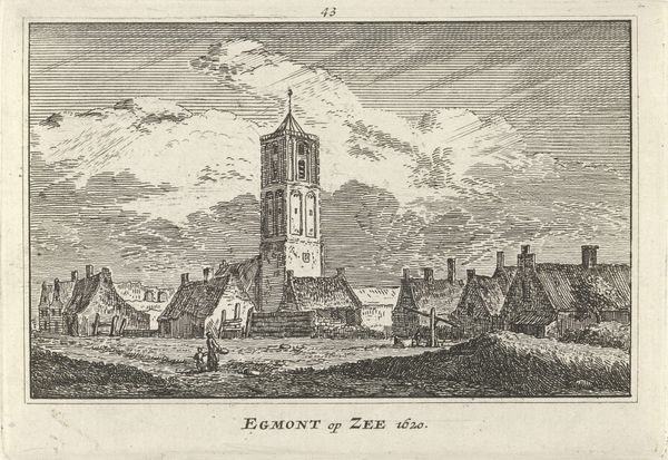 Curator: Welcome. Before us is a fascinating print entitled "Gezicht op de kerk te Warmond," or "View of the Church at Warmond." Abraham Rademaker created this Dutch Golden Age landscape between 1727 and 1733, using engraving and drawing techniques. Editor: My initial impression is one of starkness and decline. The prominent church, while grand, seems almost skeletal against the muted sky. The landscape itself is sparse, drawing attention to the building's structural details and suggesting a solemn mood. Curator: It's interesting that you use the word 'skeletal.' Notice how Rademaker’s choice of engraving allows us to clearly examine the structure: we can easily read how it was constructed from the bottom up. Also observe the labor and resources embedded within. Editor: Yes, and within a religious context, a skeletal appearance could evoke ideas of mortality and the ephemeral nature of earthly structures in contrast with enduring faith. It leads one to think about the congregation and their beliefs centered around the church in that small Dutch community. The church tower also symbolizes a reaching towards heaven. Curator: This church wasn’t immune to historical circumstances. Notice the signs of decay and even outright demolition that suggest shifts in social values impacting patronage and the maintenance of these grand religious spaces, including materials sourced, wages for labour. We tend to romanticize the Dutch Golden Age, but engravings like this offer complex commentaries on how historical forces such as changes in societal structure affect even such buildings. Editor: Rademaker subtly inserts humanity within the scene via the figures and animals dotting the landscape, a way of showing its function and position within the surrounding community. But it is curious, that the buildings nearby appear empty. A scene of abandonment. Curator: Abandonment is such a strong concept and so deeply connected to changing materials, because labor shifts from the creation of such objects to the possible re-use and reconstruction, we are only looking at the scene for a few seconds. The building probably fell to decay as the cost of labor became prohibitive. Editor: That perspective reveals how this print encapsulates a particular cultural memory and its evolving role through shifting symbols in architectural structures. Curator: By analyzing the materials and labour involved in its making we can grasp history with greater fidelity. Editor: Considering the religious and symbolic context illuminates the psychological undercurrents driving cultural continuity or change. Curator: Indeed. Together, these ways of reading unlock a richer understanding. Editor: Absolutely, it is a captivating perspective!