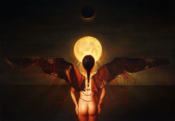 Luis Ricardo Falero painted this captivating moon nymph suspended in the night sky. The moon, a symbol of femininity, mystery, and the cyclical nature of time, looms large, cradling the figure in its crescent. The moon as a divine symbol reaches back through millennia, to the lunar goddesses of ancient Sumeria, Greece, and Rome. These goddesses embody the moon's changing phases and are often associated with the hunt and fertility. Falero’s nymph, with her arched back and reaching hand, evokes both vulnerability and powerful allure. The emotional intensity of the image lies in this duality. It’s an echo of the collective unconscious, where the moon reflects our deepest desires and fears. Her beckoning gesture could be interpreted as an invitation into the mysterious, subconscious realm. This timeless symbol resurfaces again and again, evolving, yet always retaining its capacity to stir our souls.