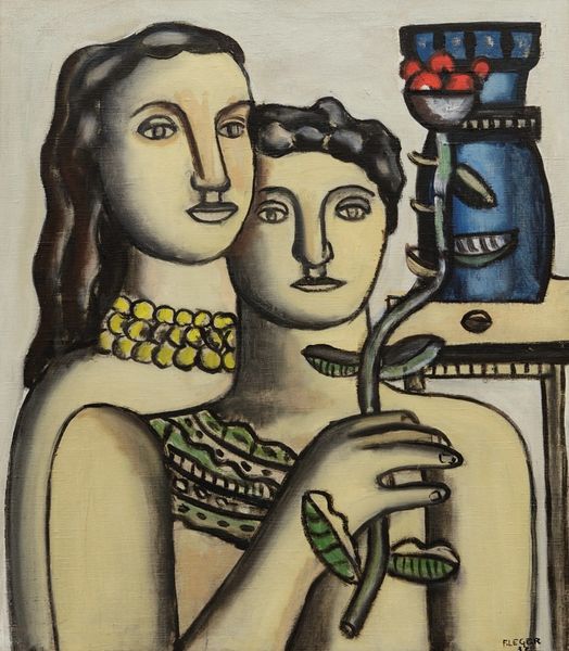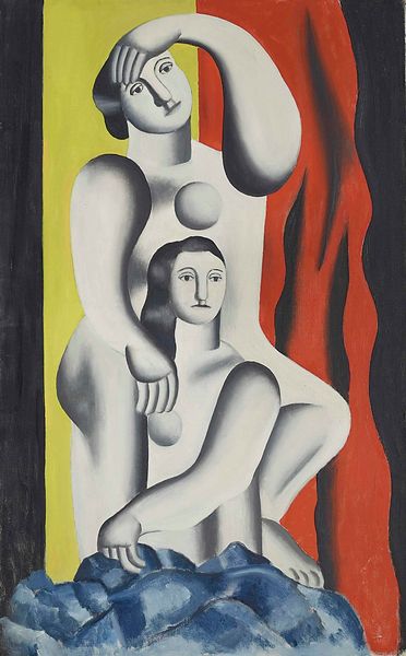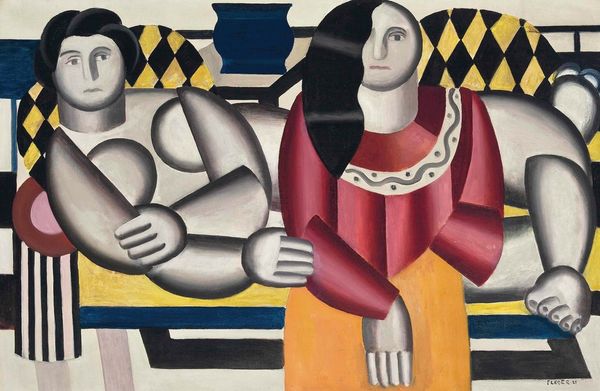 Editor: This is Fernand Léger's "Deux figures," painted in 1929 using oil paint. The contrast in skin tones is quite striking, and creates a kind of push and pull visually. How do you interpret this work? Curator: The pairing of contrasting figures—one rendered almost like a classical statue, the other more lifelike in color—speaks to Léger’s ongoing interest in reconciling tradition with modernity. He was deeply engaged in the political debates around art's role in a rapidly changing society. How do you think that tension between classical and modern plays out? Editor: Well, the geometric forms feel very modern, but you're right, the statue-like figure nods to classical art. The way they’re intertwined, almost dependent, seems significant. Curator: Exactly. Léger, in the interwar period, saw art as vital for social reconstruction, an instrument to create a shared visual language. Consider the monumental scale he often employed. How might this idealised vision have been received in the politically charged climate of the late 1920s? Editor: It's interesting to think about art as trying to create unity in such a divided time. It's more complex than just aesthetics. I’ll have to consider this in light of how museums present modernism today. Curator: Indeed. These choices - the visual language he used and how and where the work was shown – are as crucial as the artist's intent. Context truly shapes our understanding. Editor: I’m definitely going to look at Léger's other work with a different perspective now, thinking about its place in the larger social landscape. Curator: Excellent. Keep questioning the "why" behind the art and the institutions presenting it. It changes everything.